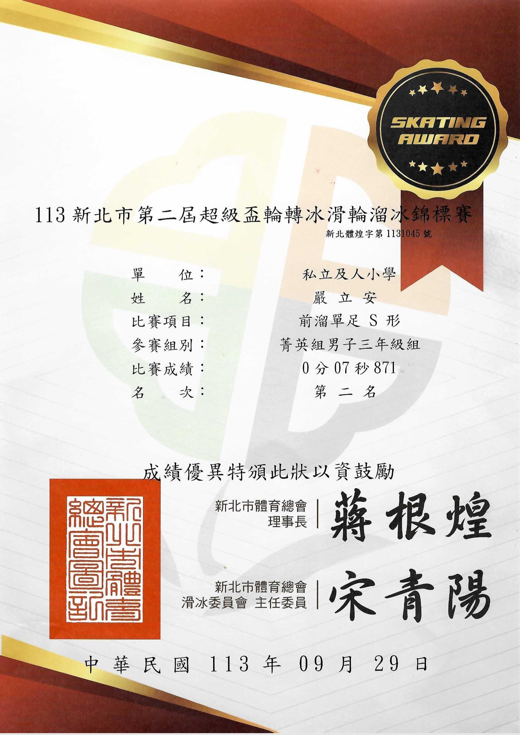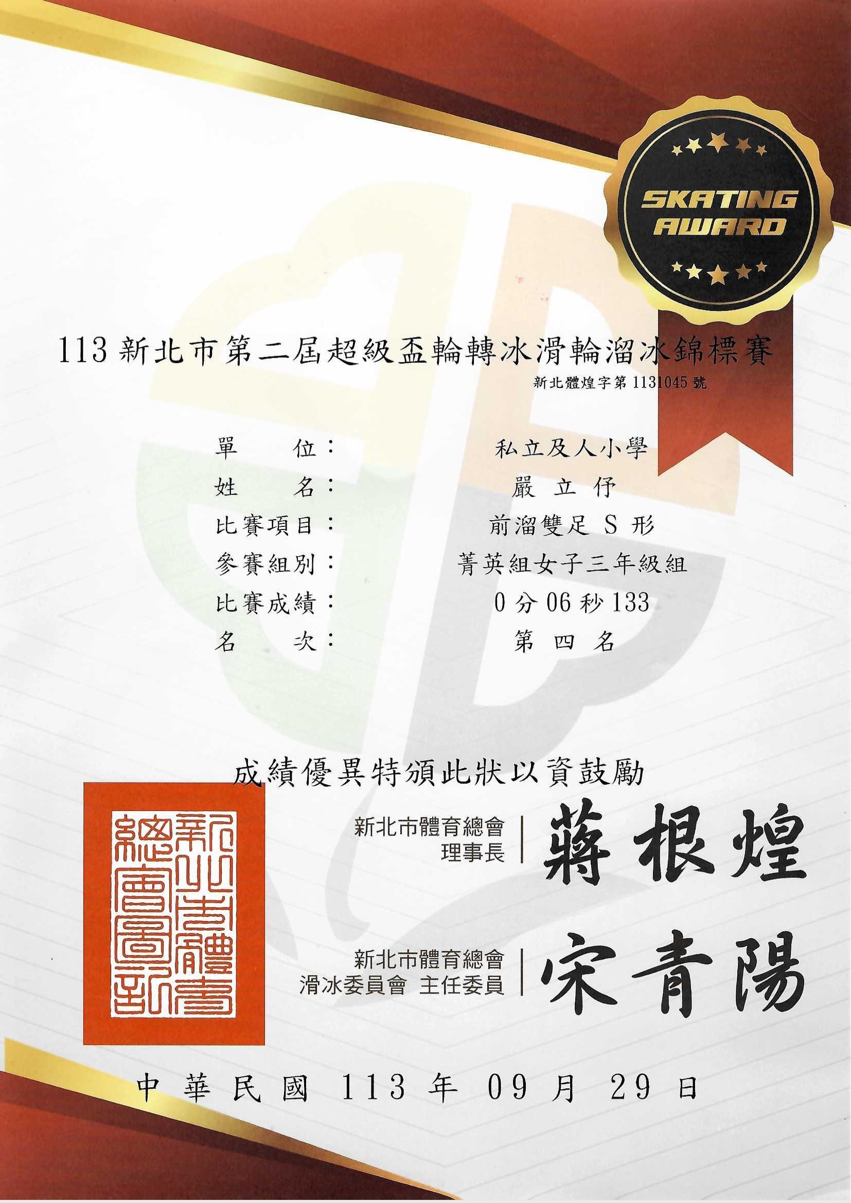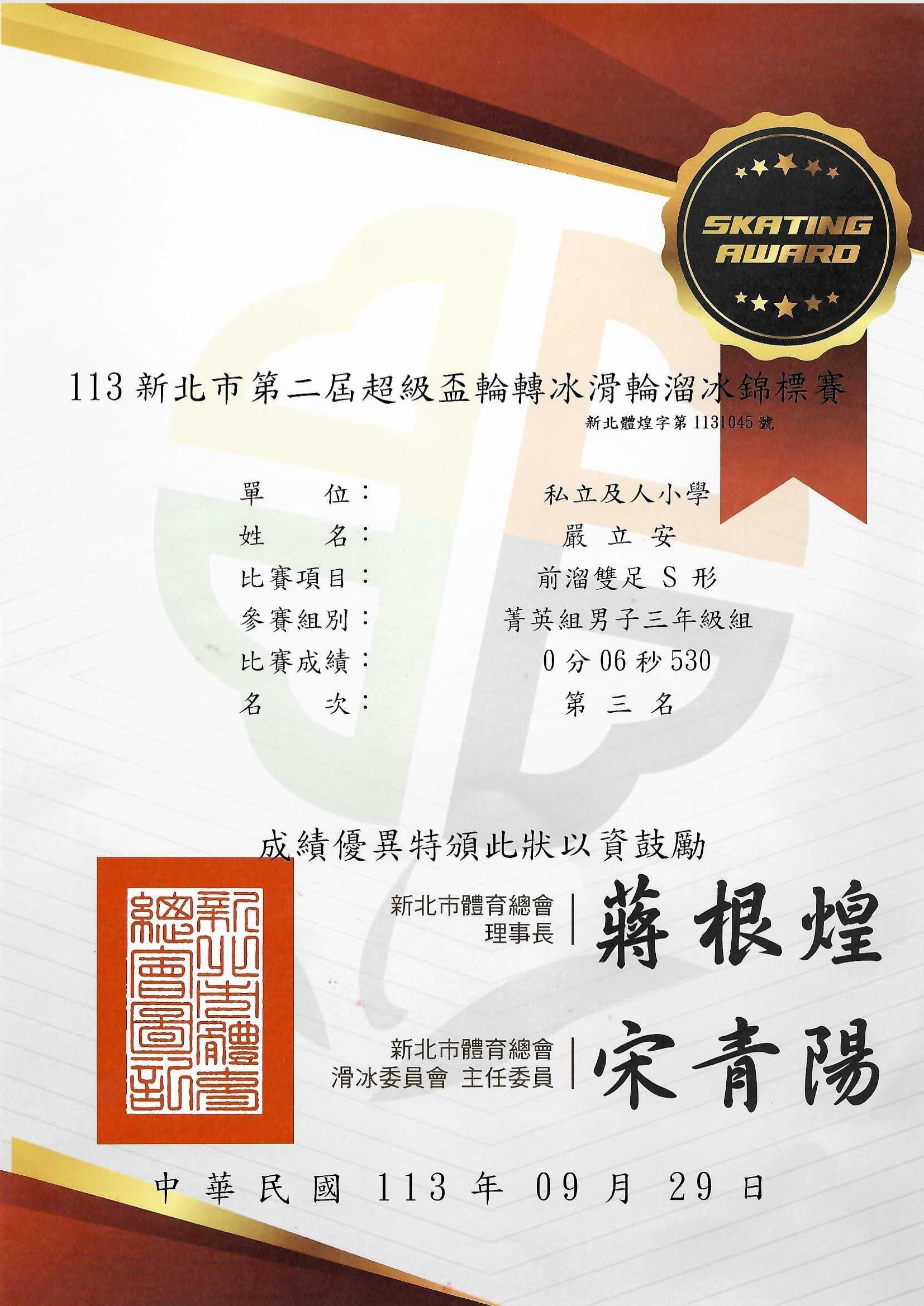 賀!本校參加113年新北市第二屆超級盃輪轉冰滑輪溜冰錦標賽成績優異!恭喜獲獎同學!感謝老師熱心指導!