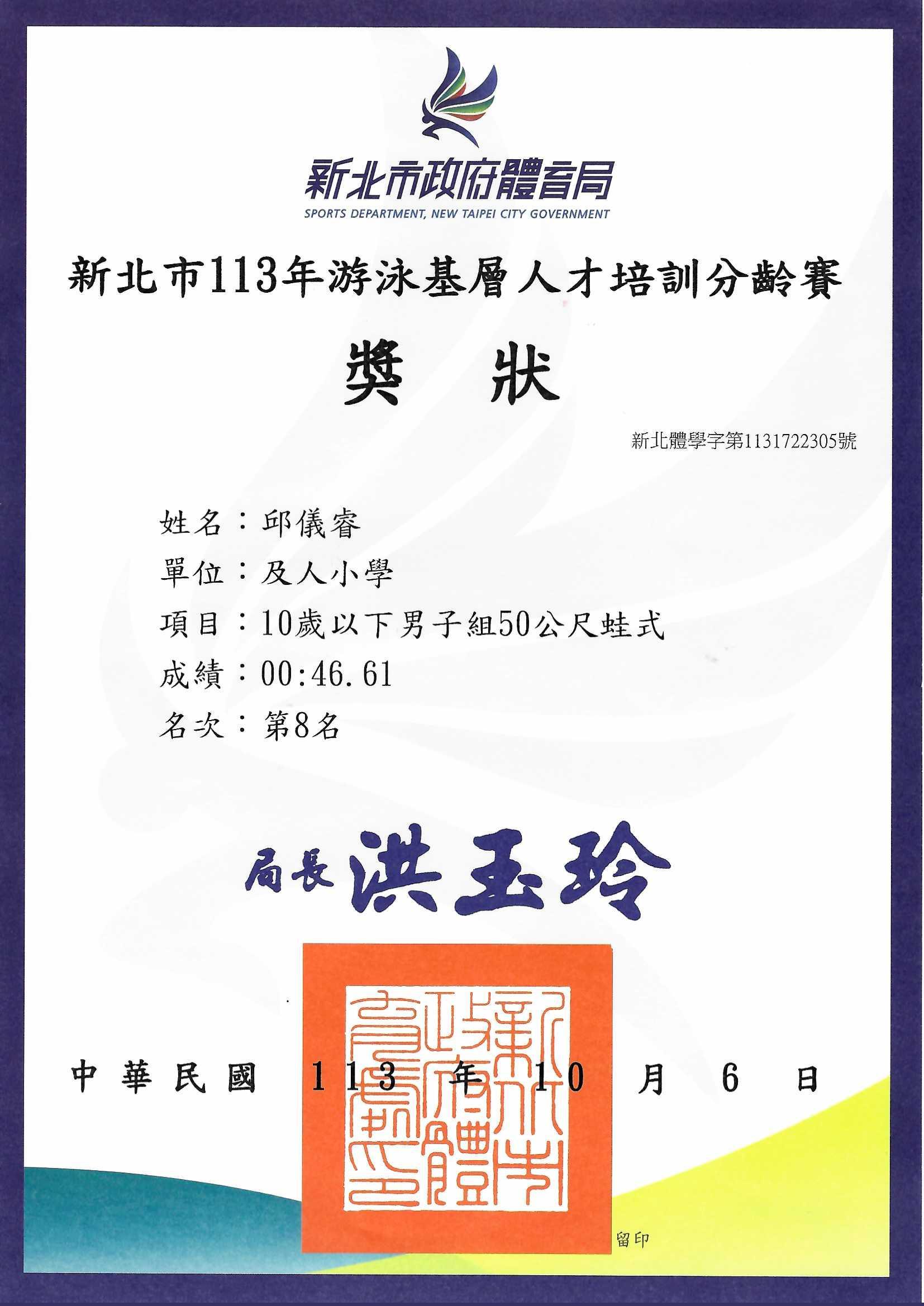 2024 10/6 本校參加新北市113年度游泳基層人才培訓分齡賽 成績優異! 賀本校參加新北市113年度游泳基層人才培訓分齡賽成績優異!恭喜獲獎同學!感謝老師熱心指導!10歲以下男子組50公尺蛙式 第8 名 五仁/邱儀睿5仁邱儀睿.jpg 263.44 KB 返回