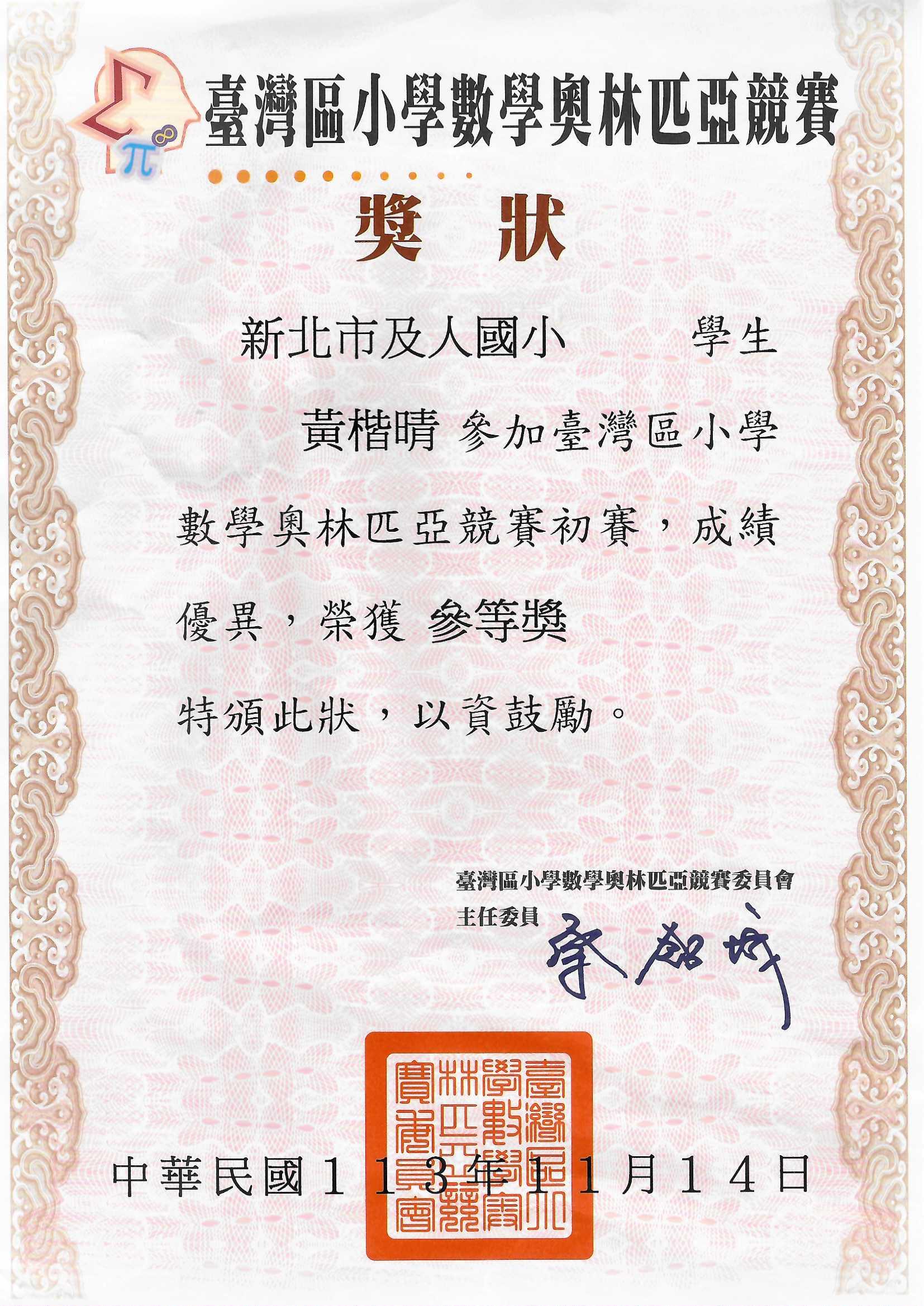 2024 11/29 六仁黃楷晴參加臺灣區小學數學奧林匹克競賽初賽榮獲叁等獎! 賀!本校六仁黃楷晴參加臺灣區小學數學奧林匹克競賽初賽榮獲叁等獎!恭喜獲獎!感謝老師熱心指導! 00.jpg 491.29 KB 返回