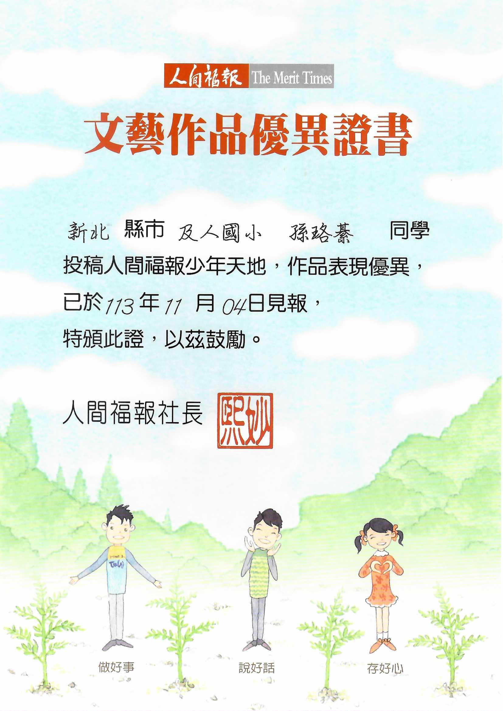 賀!本校六忠孫珞綦投稿人間福報少年天地作品表現優異!感謝老師熱心指導!