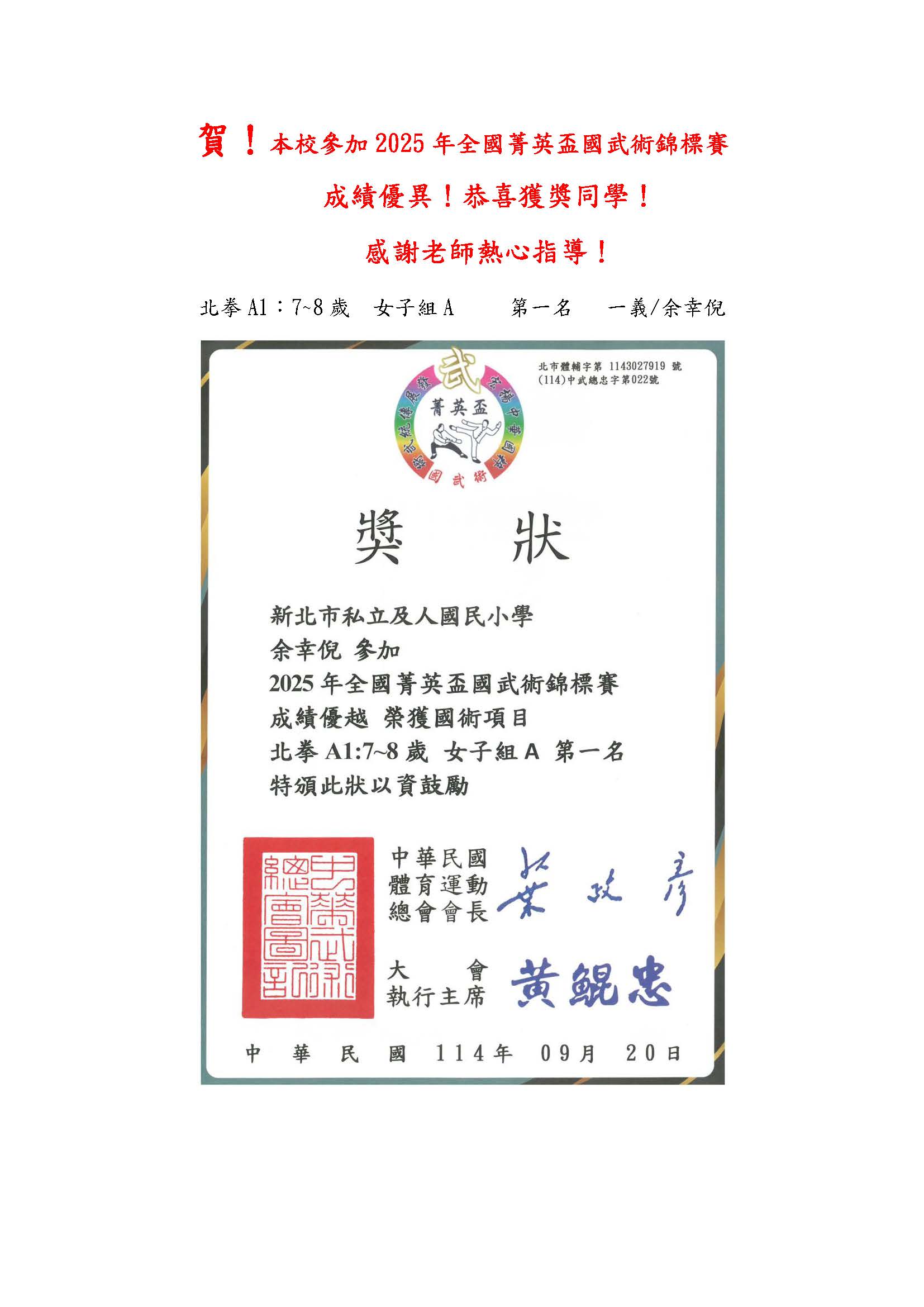 賀 本校參加2025年全國菁英盃國武術錦標賽 成績優異 恭喜獲獎同學!