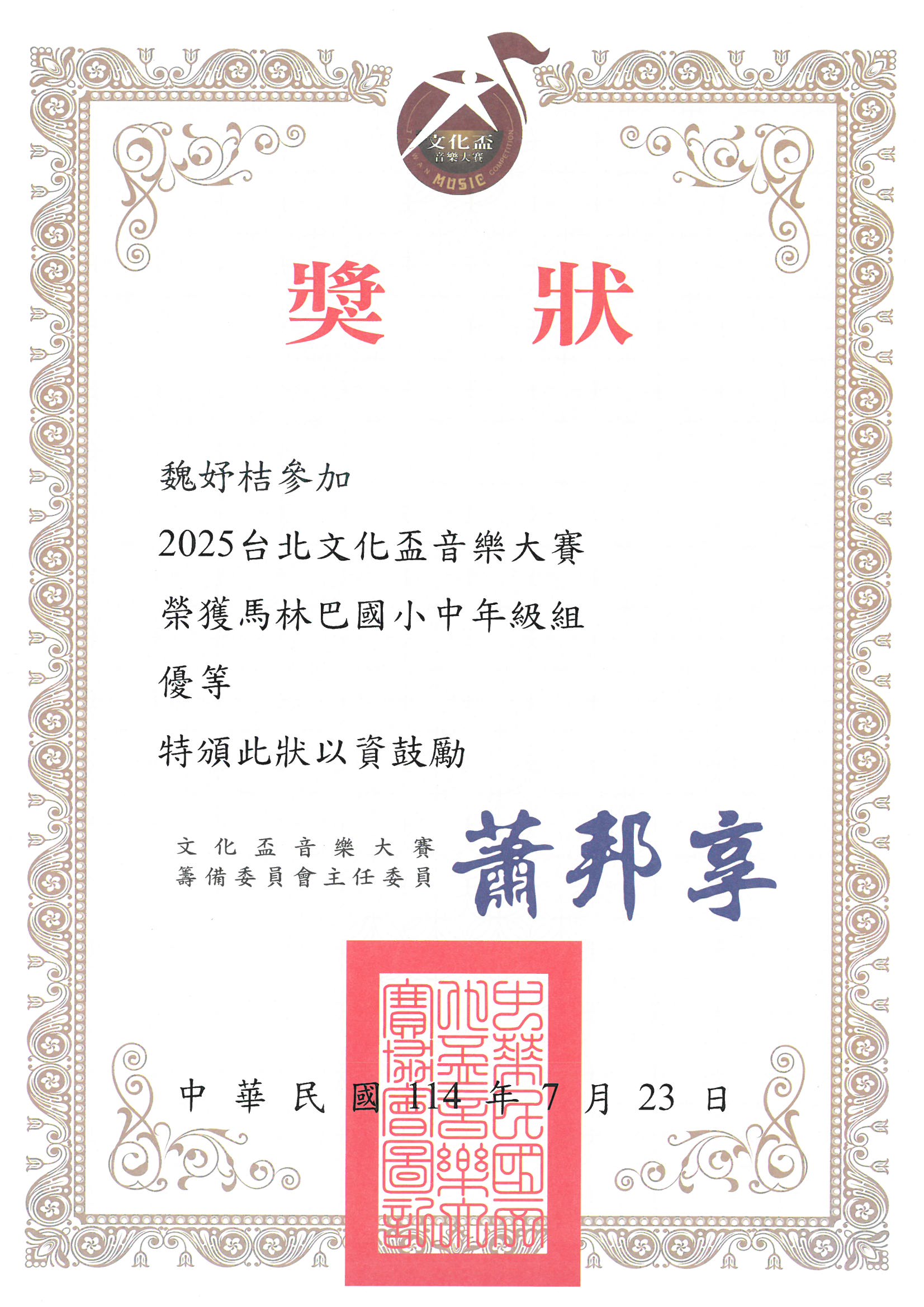 2025 9/23 賀 本校2025台北文化盃音樂大賽 成績優異 恭喜魏妤桔同學! 四年愛班 魏妤桔參加2025台北文化盃音樂大賽馬林巴國小中年級組 優等 SKM_C364e25092317300.jpg 431.99 KB 返回