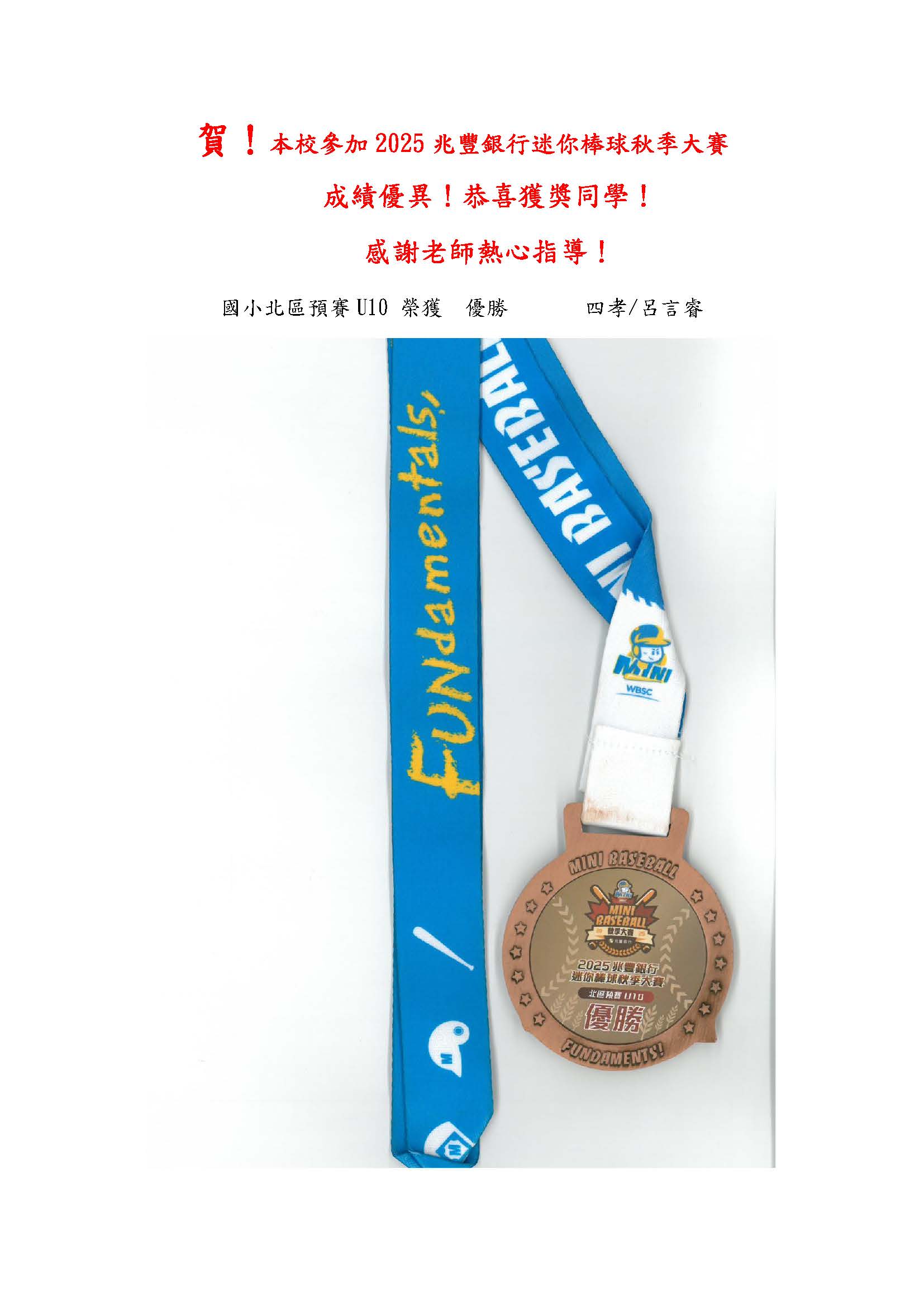賀 本校參加2025兆豐銀行迷你棒球秋季大賽 成績優異 恭喜獲獎同學!