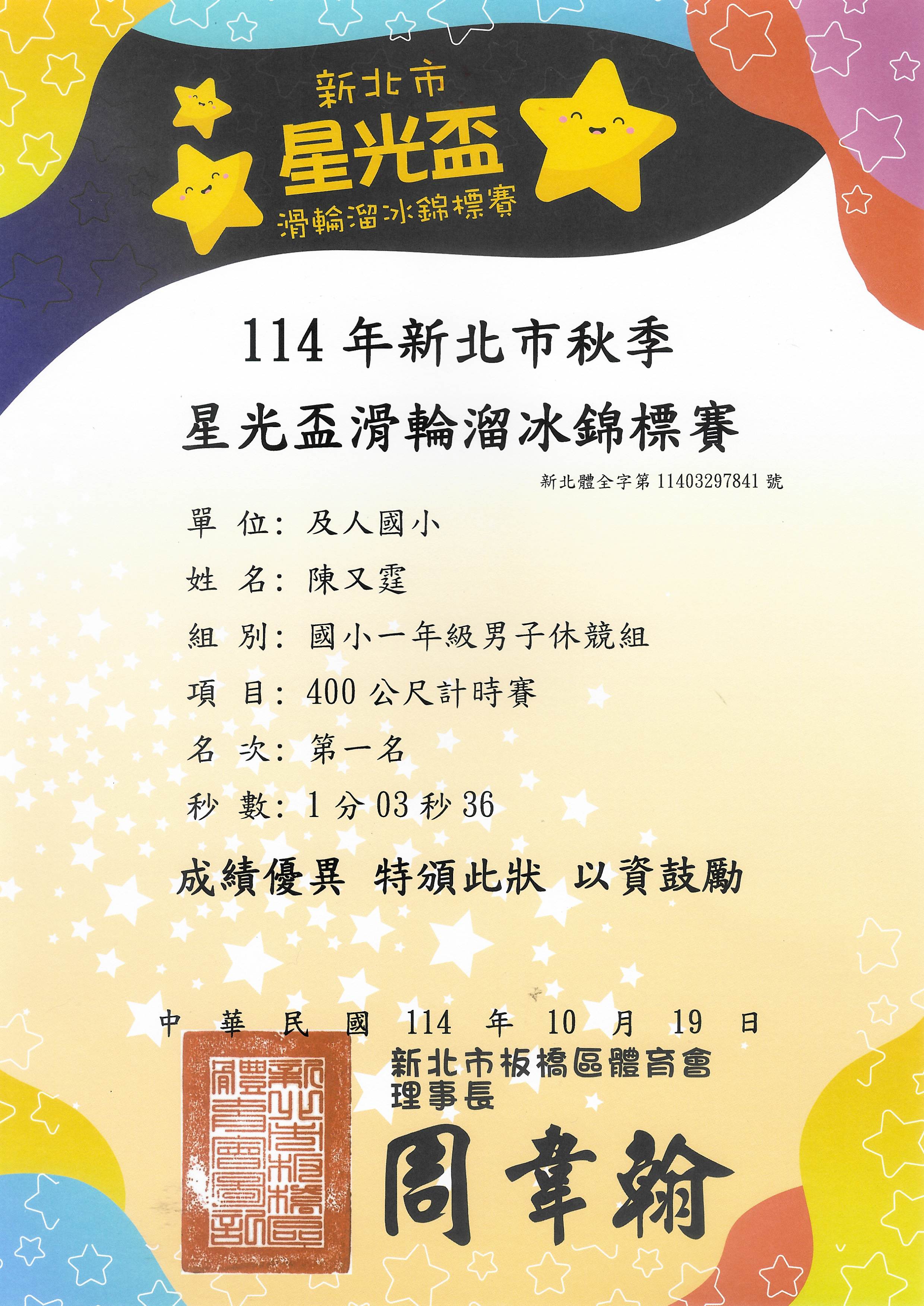 2025 10/20 賀 本校一平陳又霆參加114年新北市秋季星光盃滑輪溜冰錦標賽 400公尺計時賽 第一名 賀 本校一平陳又霆參加114年新北市秋季星光盃滑輪溜冰錦標賽 國小一年級男子休競組 400公尺計時賽 第一名陳又霆400.jpg 758.94 KB 返回