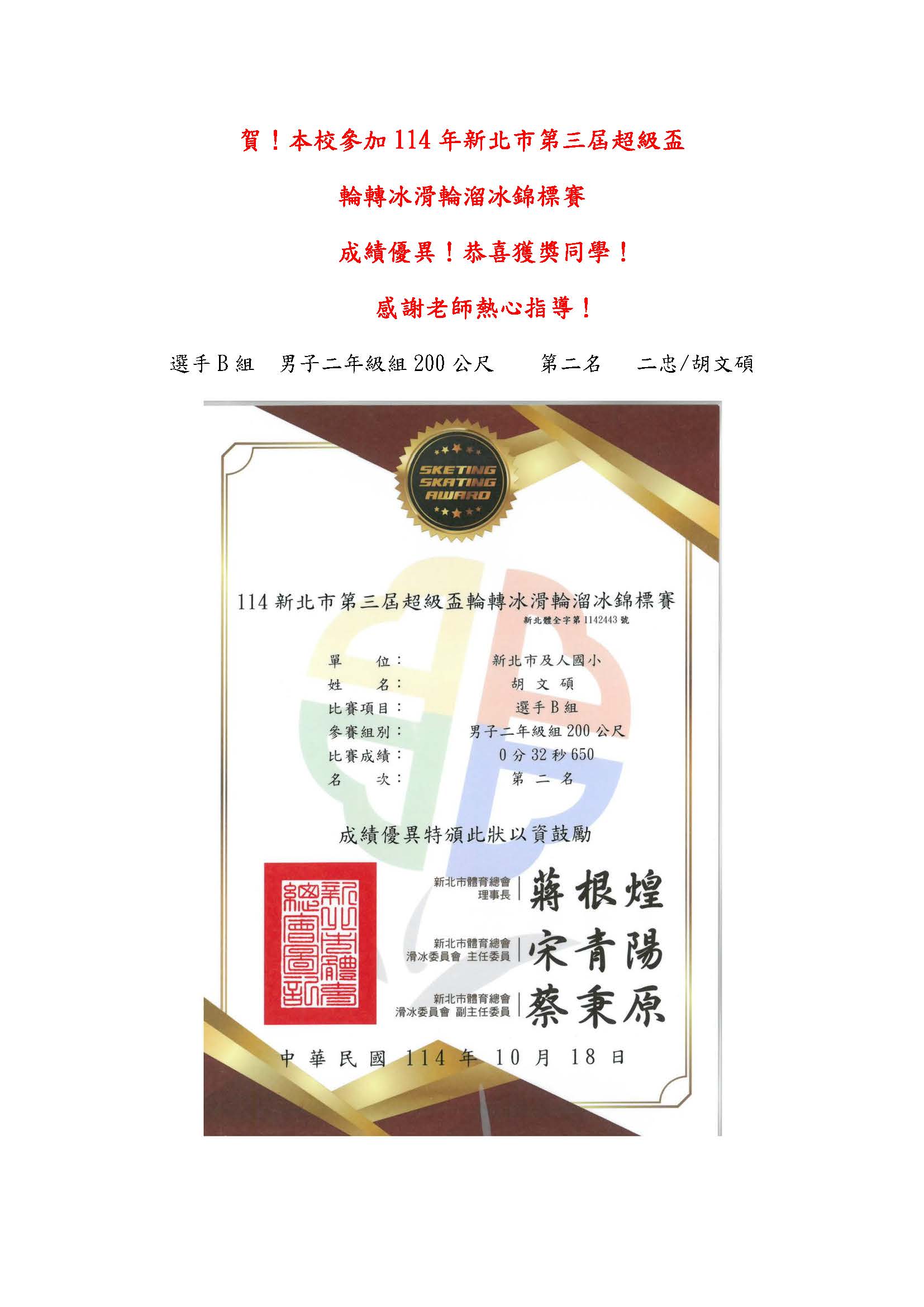 2025 10/22 賀 本校參加114年新北市第三屆超級盃 輪轉冰滑輪溜冰錦標賽 成績優異 恭喜獲獎同學 1141018-114年新北市第三屆超級盃輪轉冰滑輪溜冰錦標賽上網.jpg 179.21 KB 返回