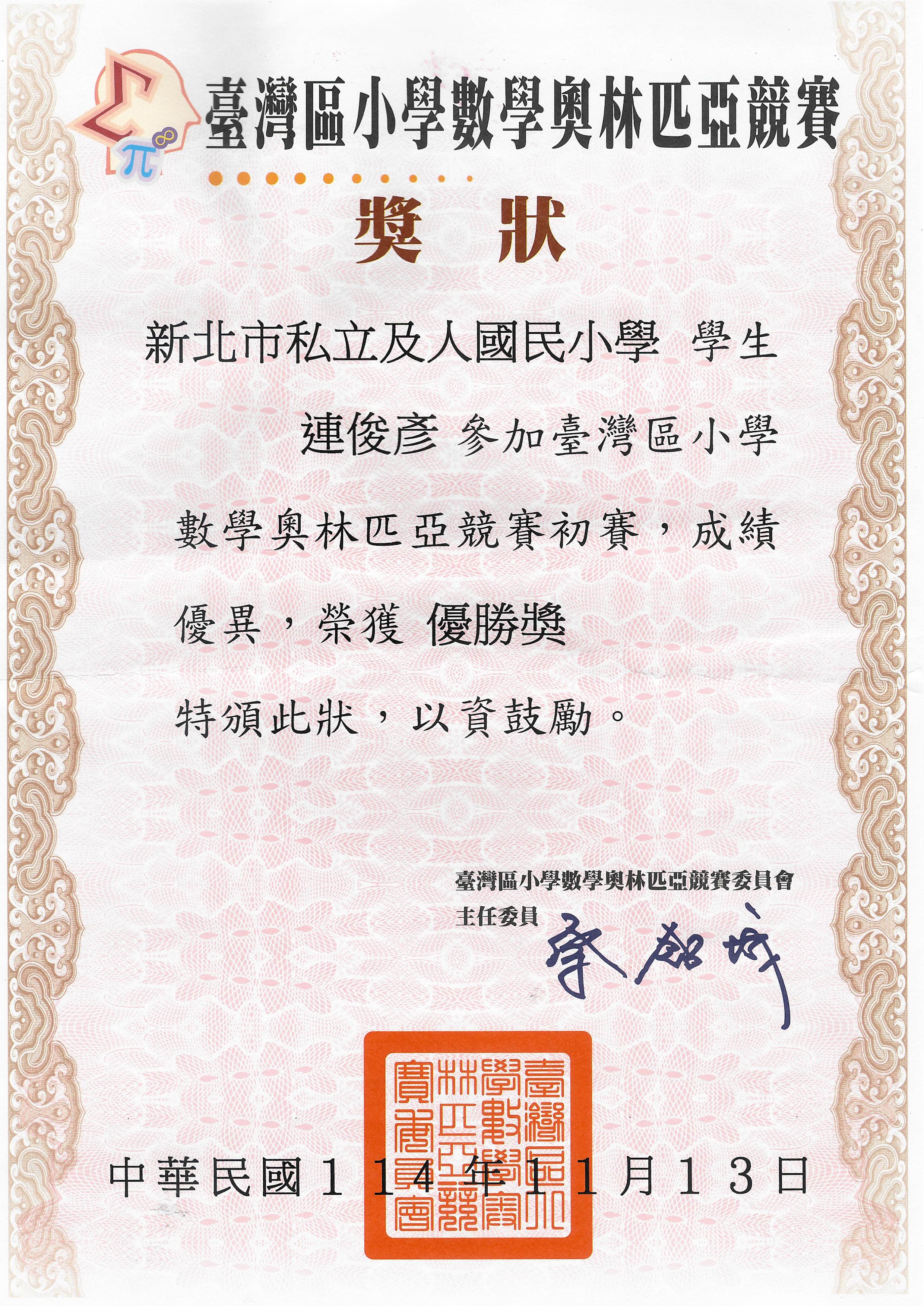 賀!本校六愛連俊彥參加台灣區小學數學奧林匹亞初賽 榮獲優勝獎