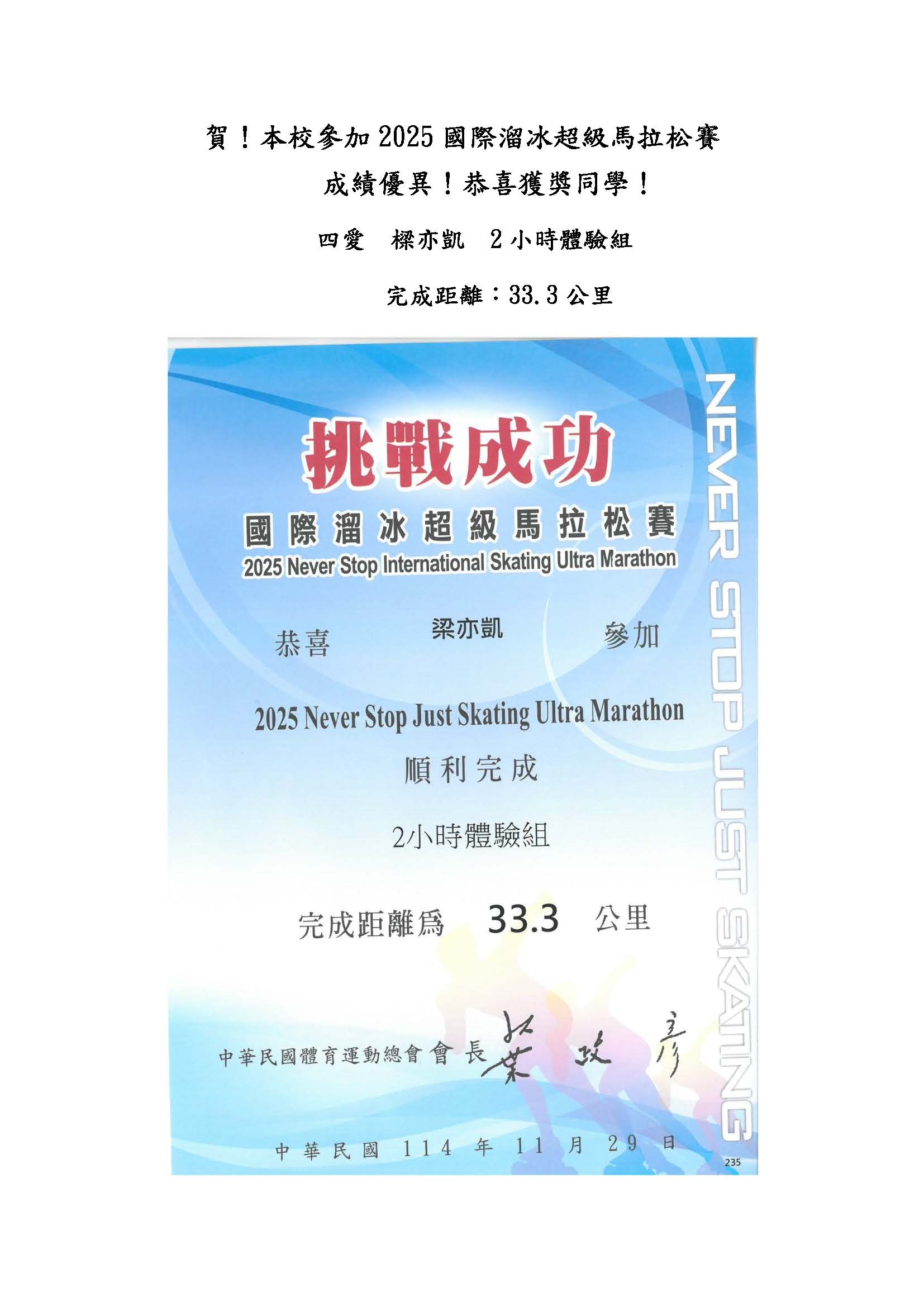 賀 本校參加2025國際溜冰超級馬拉松賽 成績優異 恭喜獲獎同學