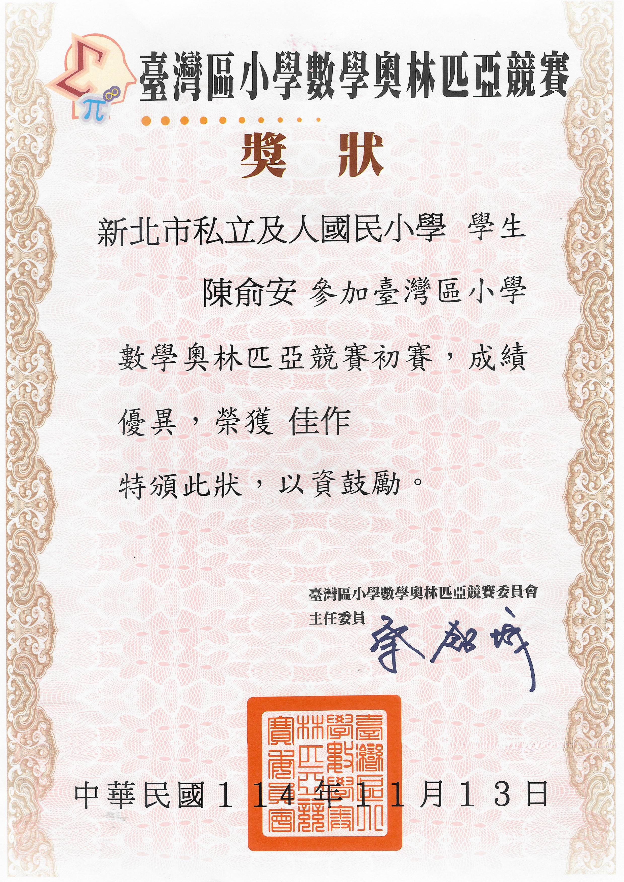 賀!本校六忠陳俞安參加台灣區小學數學奧林匹亞初賽 榮獲佳作,恭喜獲獎同學!