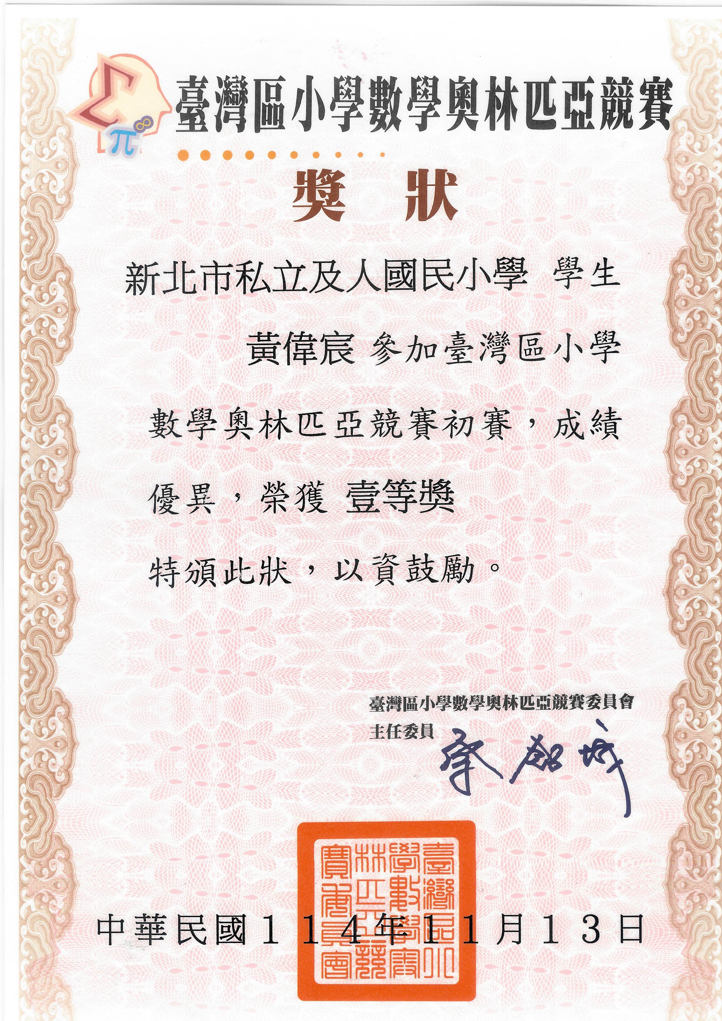 賀!本校六忠黃偉宸參加台灣區小學數學奧林匹亞初賽 榮獲壹等獎