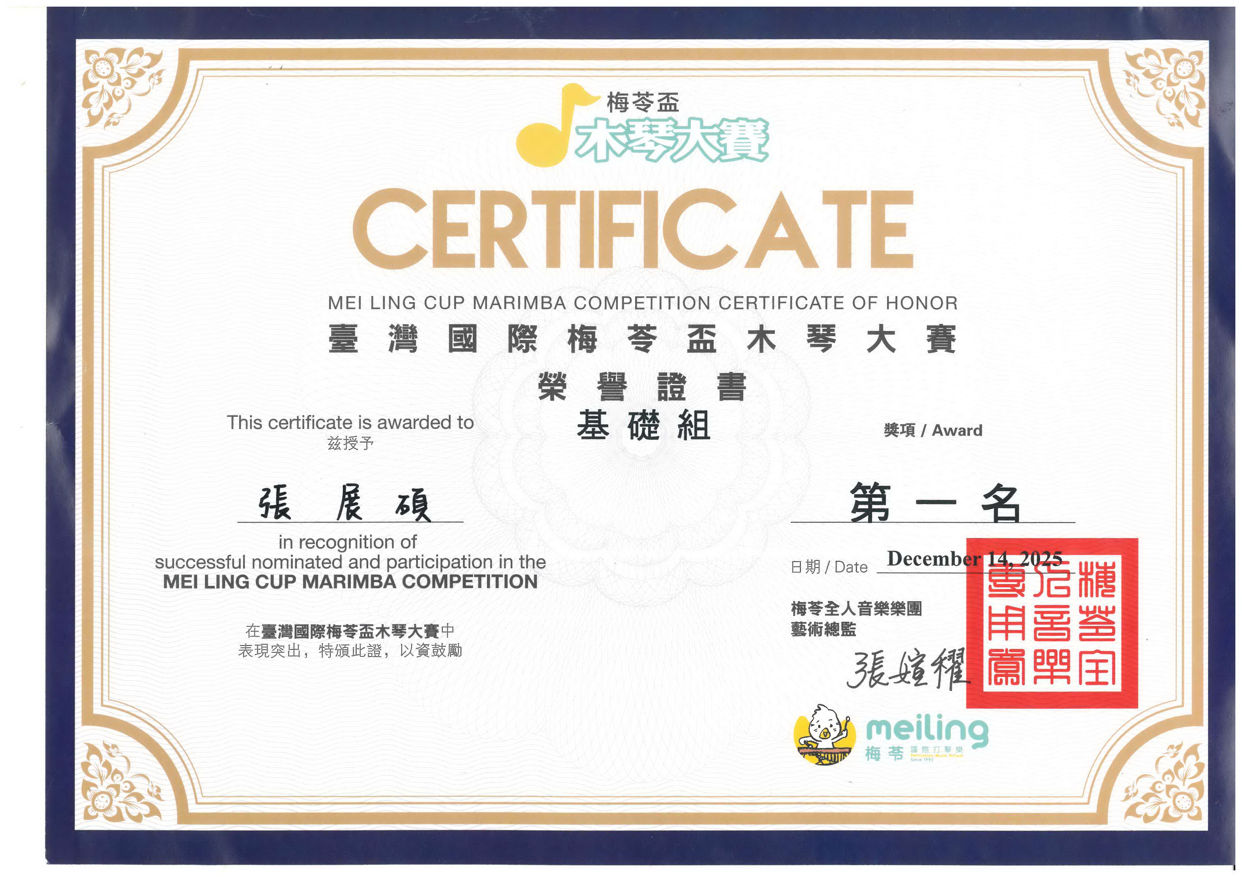 賀!本校三和參加臺灣國際梅苓盃木琴大賽基礎組 榮獲第一名!