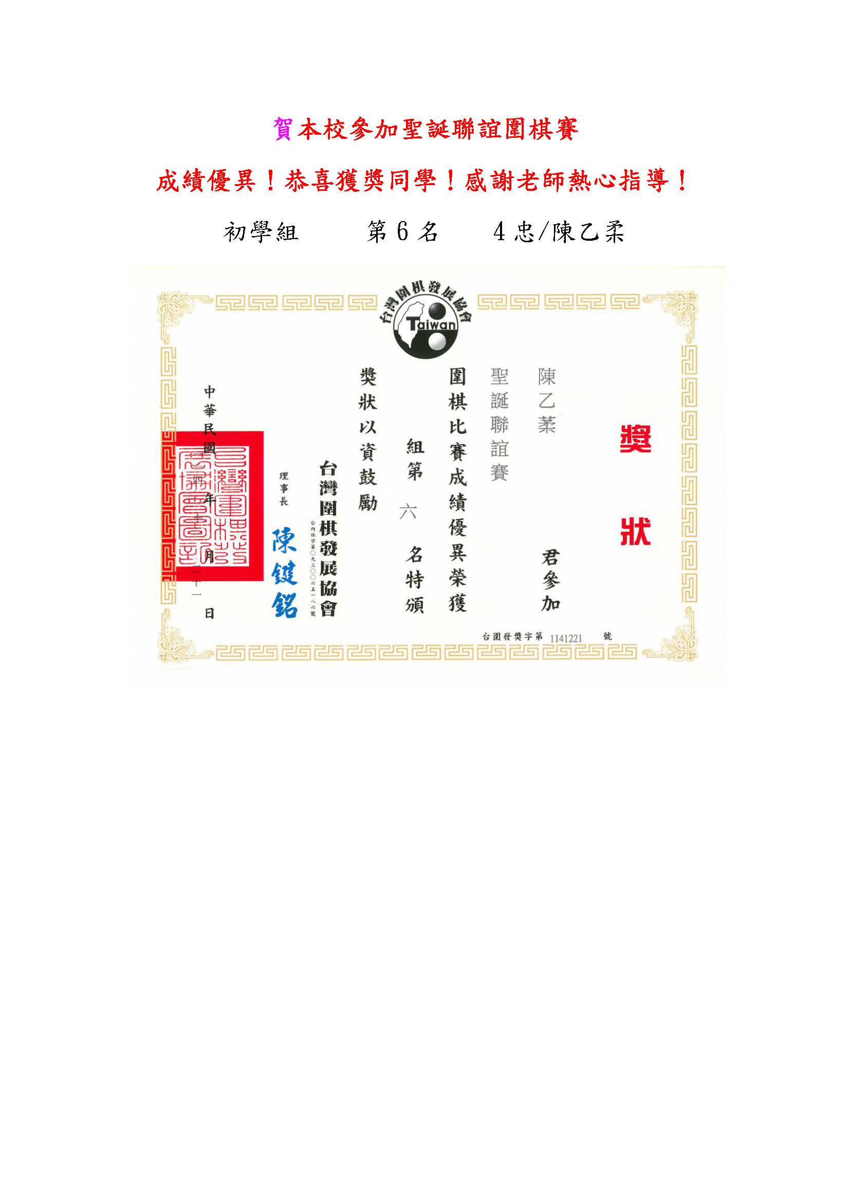 賀本校參加聖誕聯誼圍棋賽 成績優異 恭喜獲獎同學