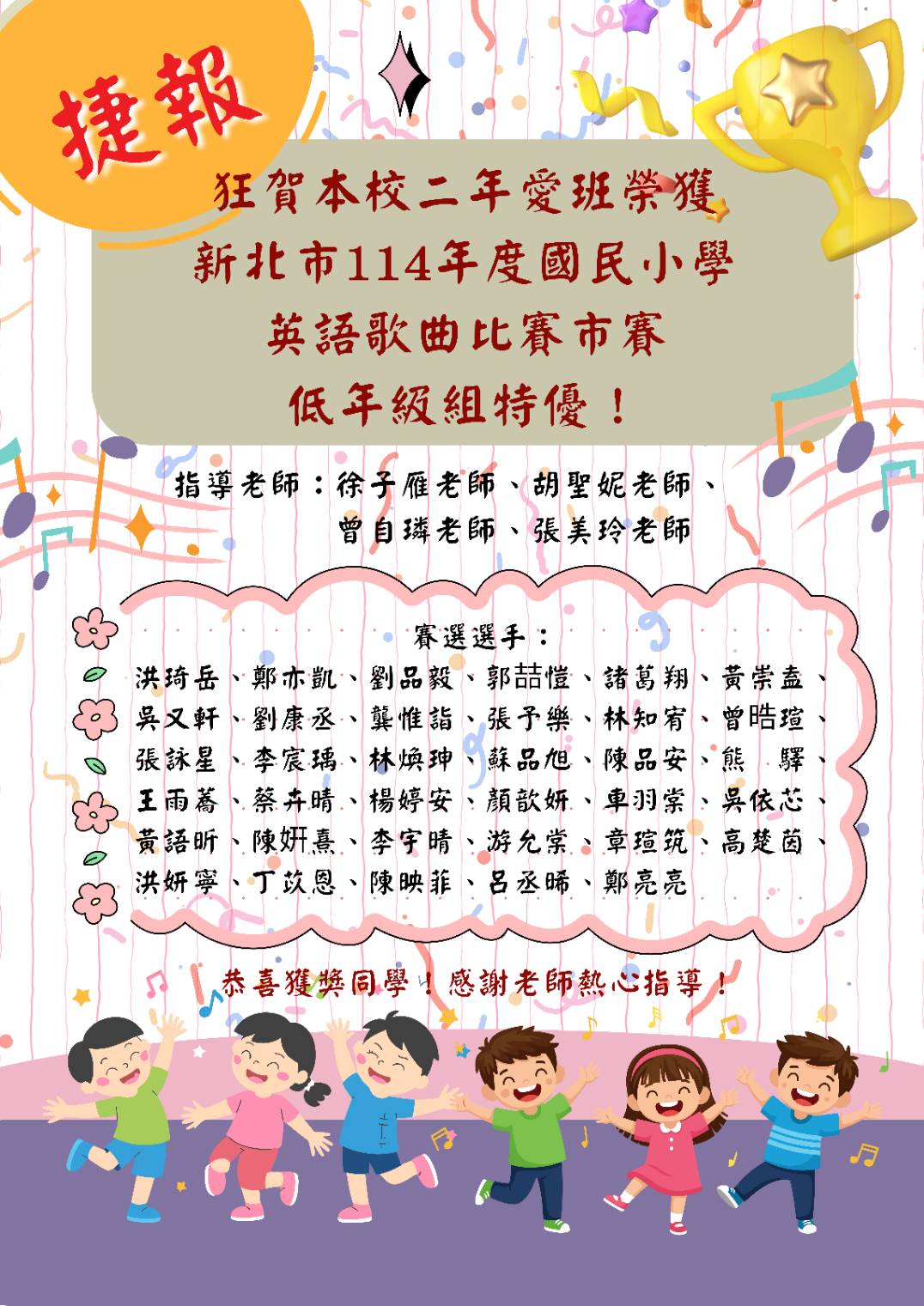 賀! 本校參加新北市114年度英語歌曲演唱競賽市賽成績優異!