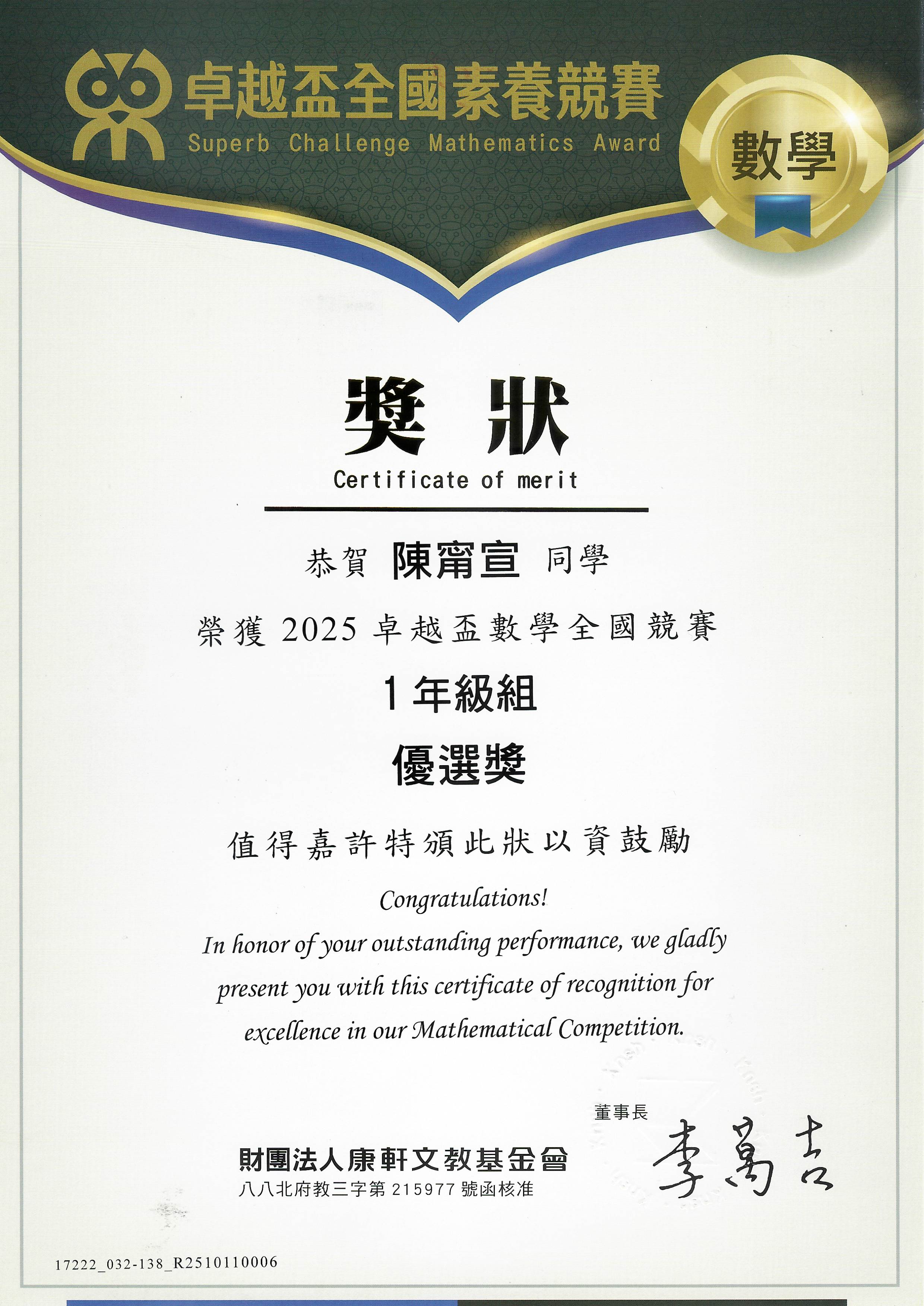 2026 1/16 賀 本校一義陳甯宣同學參加2025卓越盃數學全國競賽1年級組 成績優異 恭喜獲獎同學! 賀 本校一義陳甯宣同學參加2025卓越盃數學全國競賽1年級組 榮獲優選獎 恭喜獲獎同學!陳甯宣卓越盃數學優選獎.jpg 739.73 KB 返回
