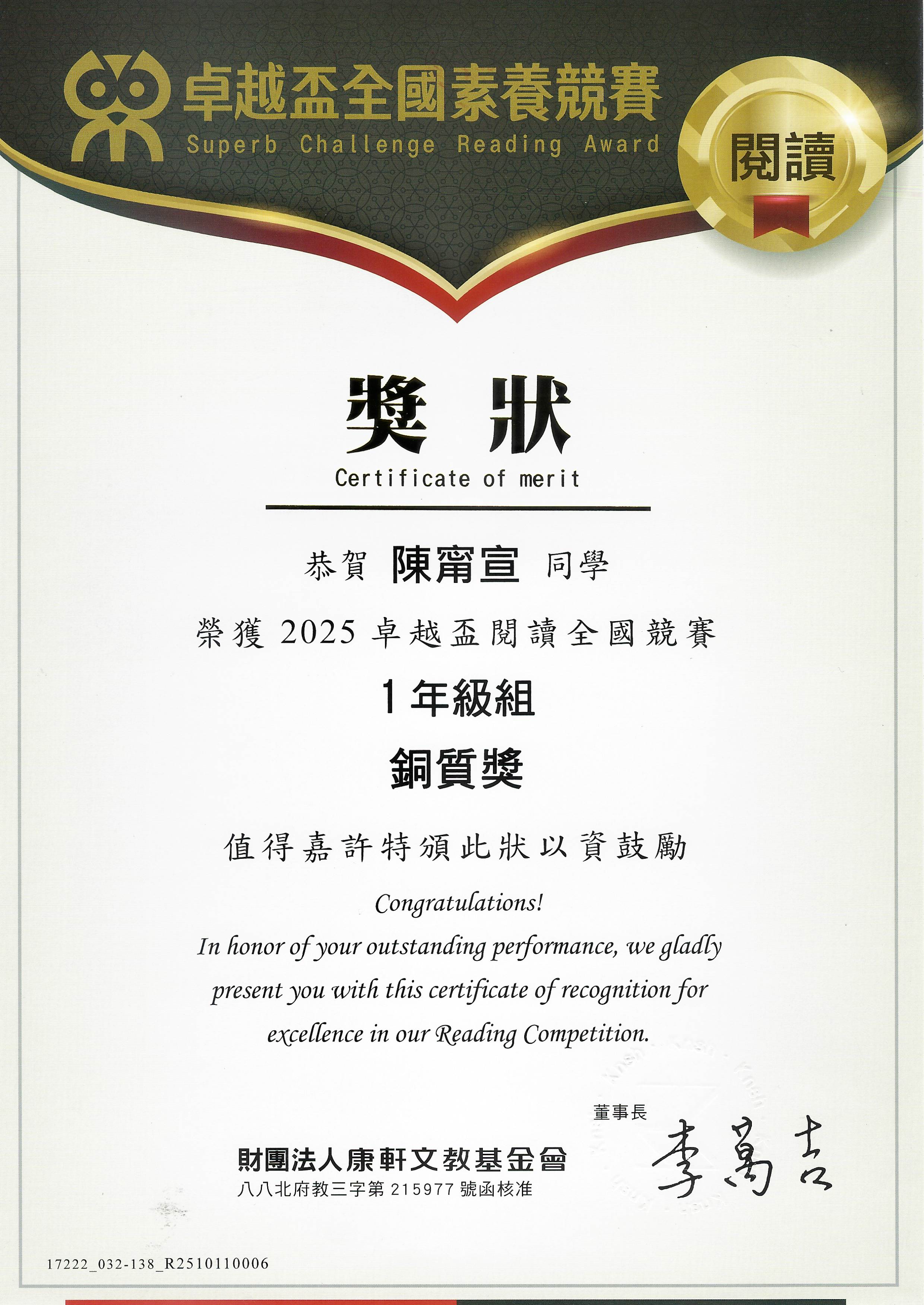 2026 1/16 賀 本校一義陳甯宣同學參加2025卓越盃閱讀全國競賽1年級組 成績優異 恭喜獲獎同學! 賀 本校一義陳甯宣同學參加2025卓越盃閱讀全國競賽1年級組 榮獲銅質獎 恭喜獲獎同學!陳甯宣閱讀銅質獎.jpg 749.12 KB 返回