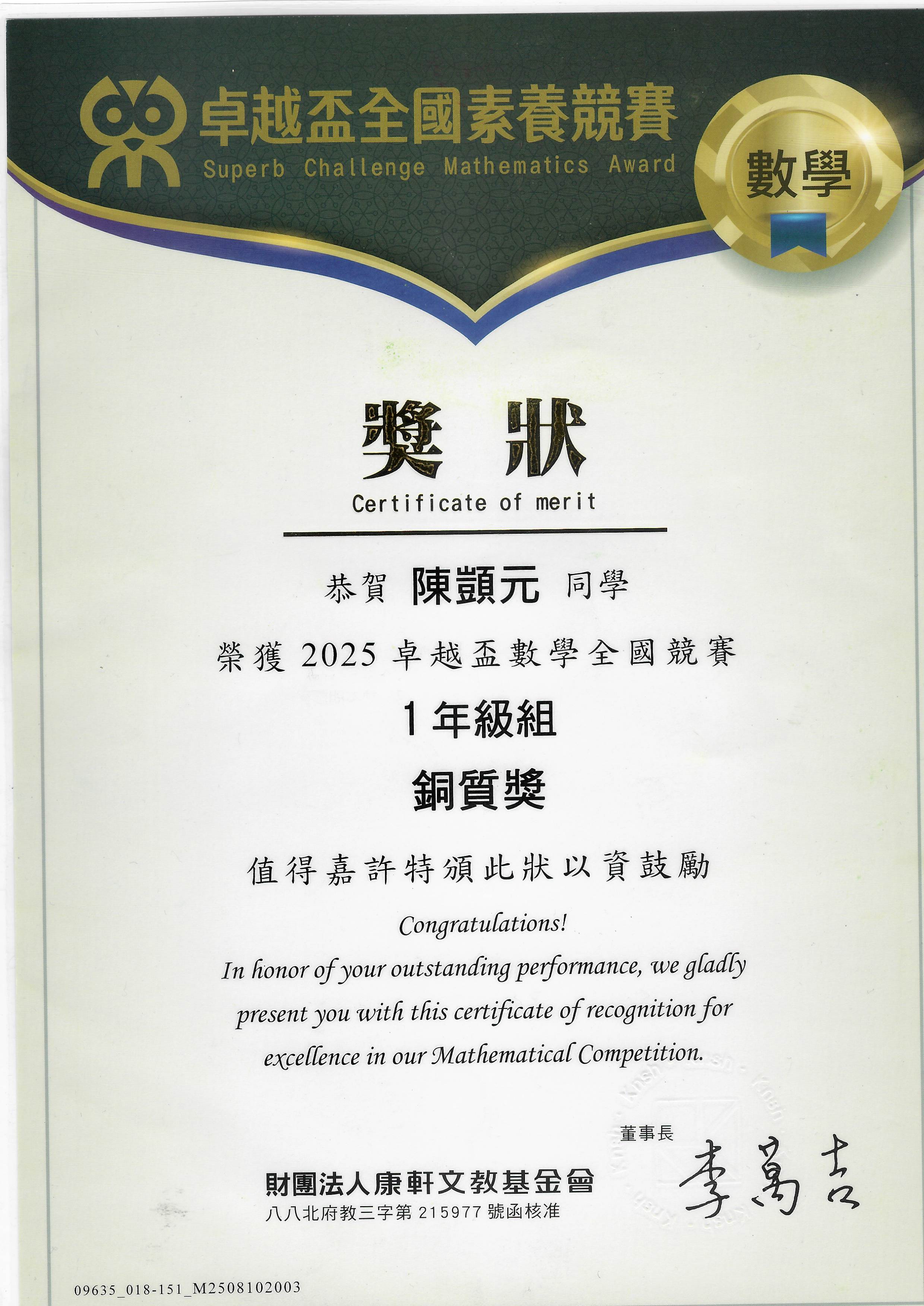 2026 1/16 賀 本校一義陳顗元同學參加2025卓越盃數學全國競賽1年級組 成績優異 恭喜獲獎同學! 賀 本校一義陳顗元同學參加2025卓越盃數學全國競賽1年級組 榮獲銅質獎 恭喜獲獎同學!陳顗元卓越盃數學銅質獎.jpg 704.9 KB 返回
