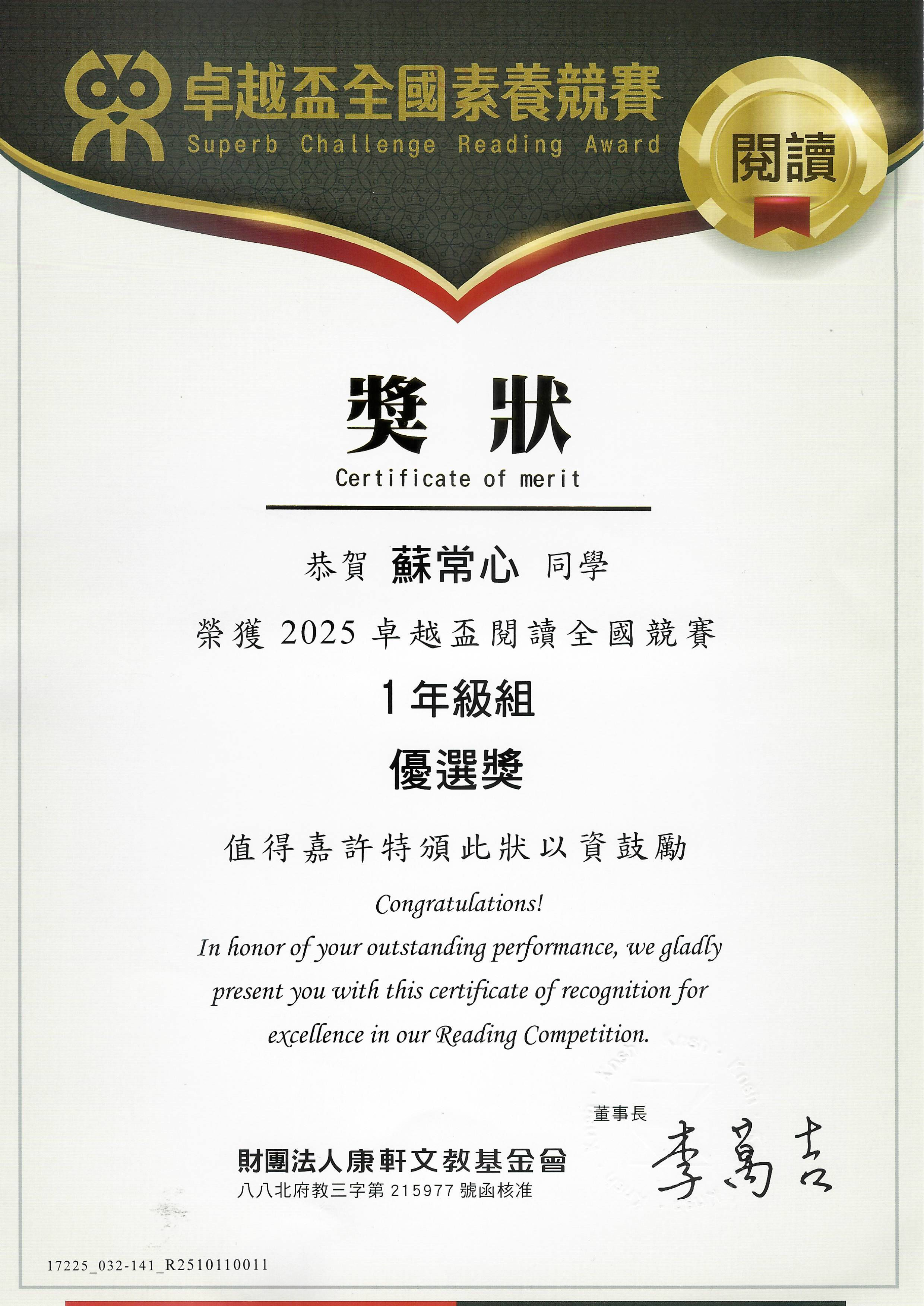 2026 1/19 賀 本校一仁蘇常心同學參加2025卓越盃閱讀全國競賽1年級組 成績優異 恭喜獲獎同學! 賀 本校一仁蘇常心同學參加2025卓越盃閱讀全國競賽1年級組 榮獲優選獎 恭喜獲獎同學!一仁蘇常心閱讀優選獎.jpg 752.72 KB 返回