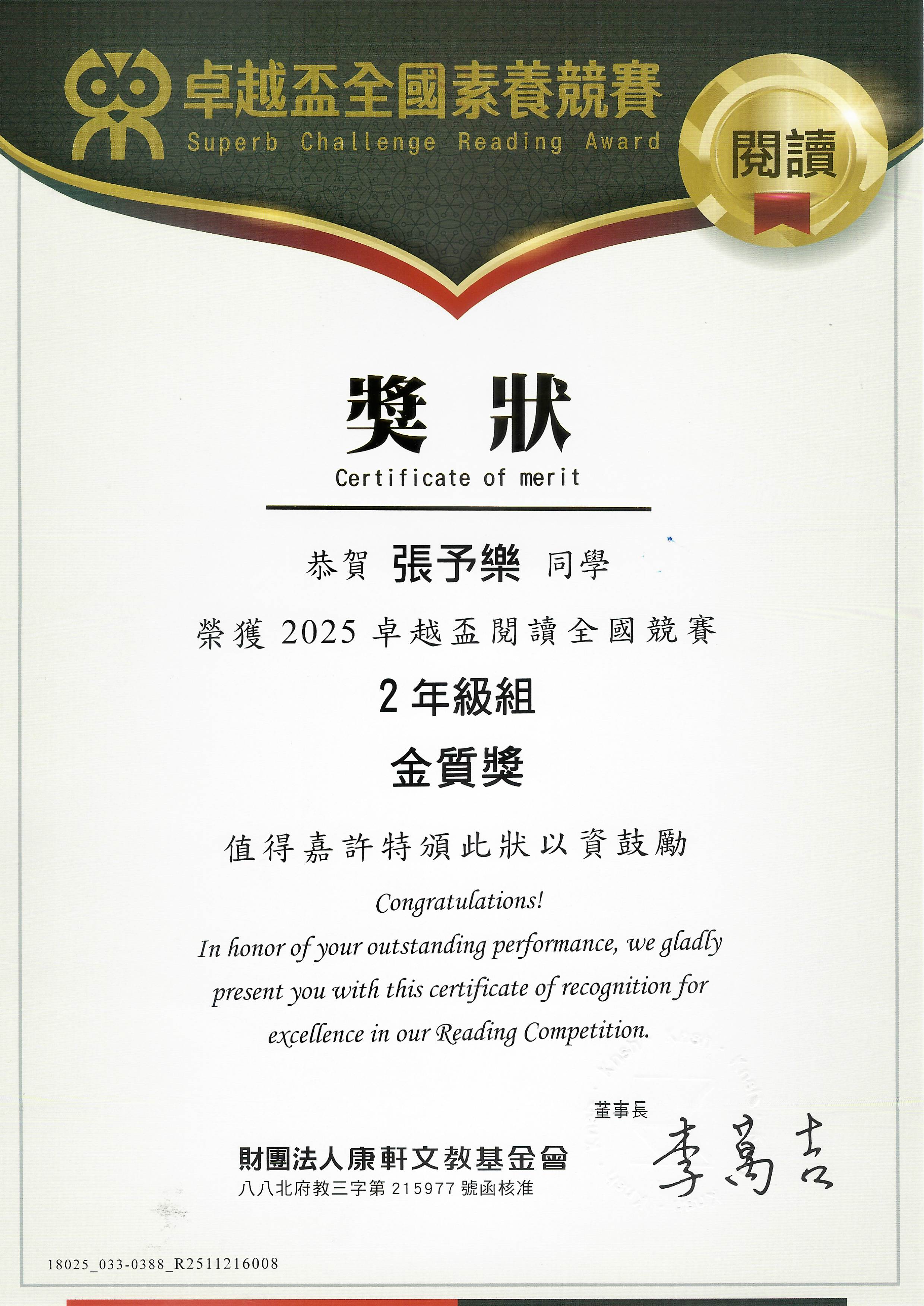 2026 1/20 賀 本校二愛張予樂同學參加2025卓越盃閱讀全國競賽2年級組 成績優異 恭喜獲獎同學! 賀 本校二愛張予樂同學參加2025卓越盃閱讀全國競賽2年級組 榮獲金質獎 恭喜獲獎同學!二愛張予樂閱讀.jpg 728.46 KB 返回