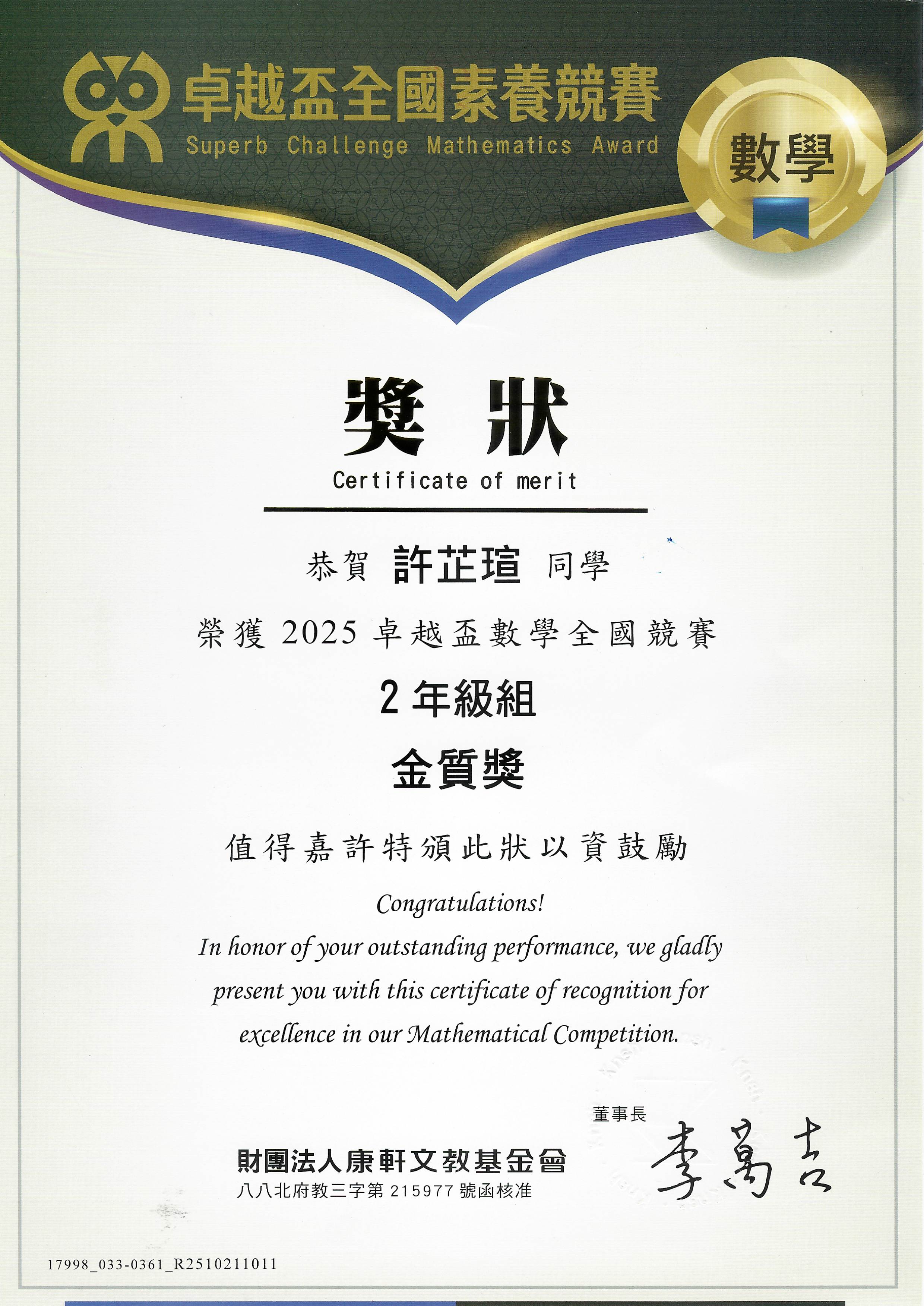 2026 1/21 賀 本校二忠許芷瑄同學參加2025卓越盃數學全國競賽2年級組 成績優異 恭喜獲獎同學! 賀 本校二忠許芷瑄同學參加2025卓越盃數學全國競賽2年級組 榮獲金質獎 恭喜獲獎同學!許芷瑄數學金質.jpg 754.94 KB 返回