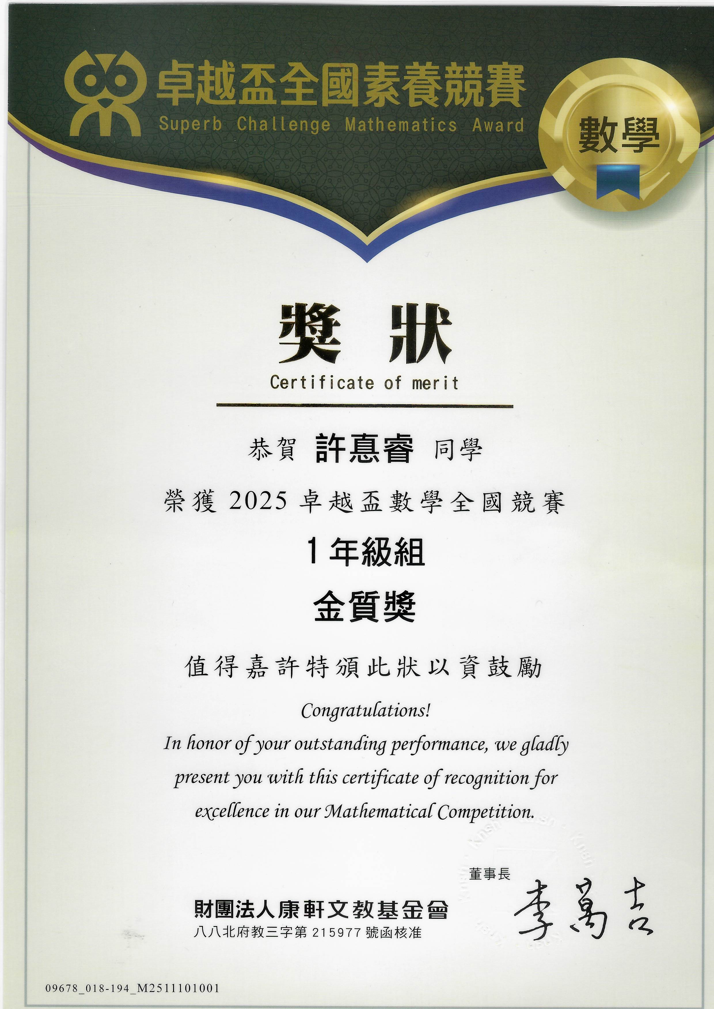 2026 2/23 賀 本校一愛許惪睿同學參加2025卓越盃數學全國競賽 成績優異 恭喜獲獎同學! 賀 本校一愛許悳睿同學參加2025卓越盃數學全國競賽 榮獲1年級組金質獎 恭喜獲獎同學!一愛許悳睿卓越盃.jpg 690.99 KB 返回