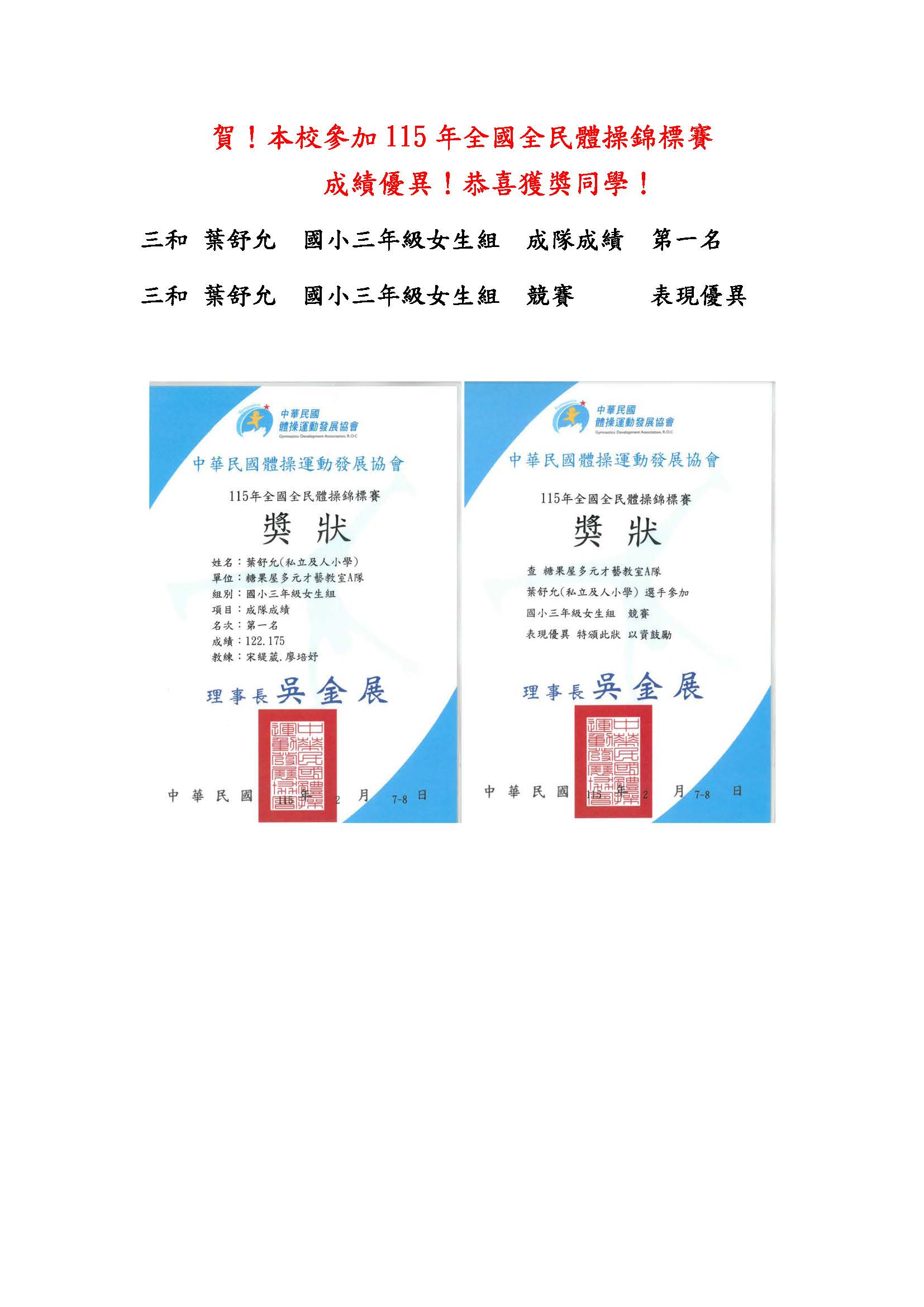 賀 本校參加115年全國全民體操錦標賽 成績優異 恭喜獲獎同學!