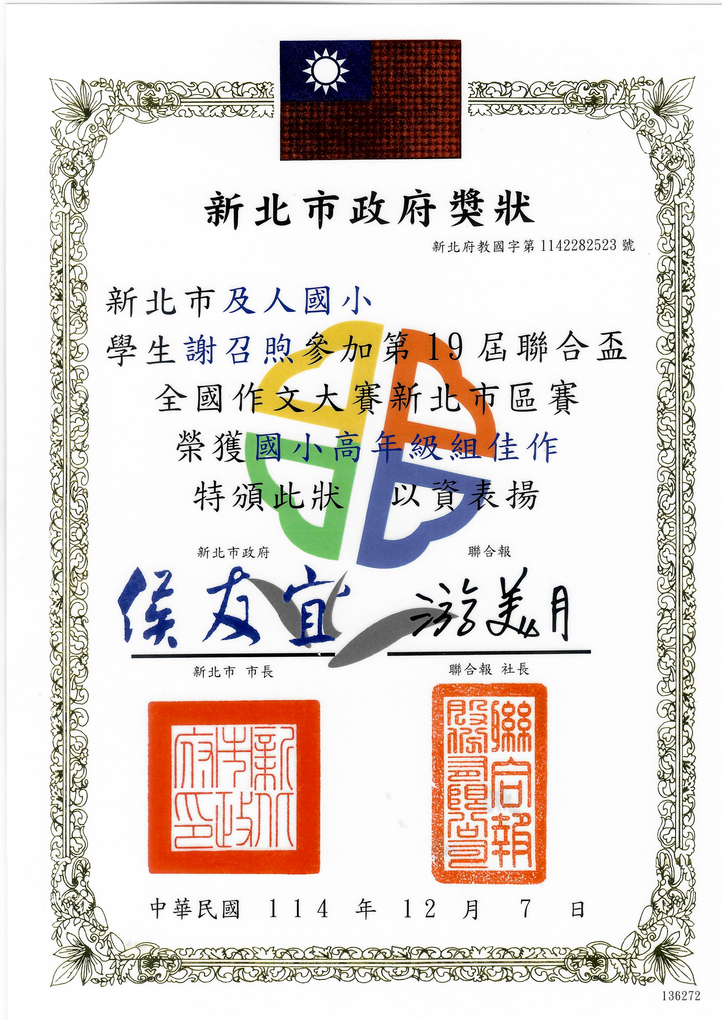 2026 2/26 賀 本校六愛謝召煦同學參加第19屆聯合盃全國作文大賽新北市區賽 成績優異 恭喜獲獎同學! 賀 本校六愛謝召煦參加第19屆聯合盃全國作文大賽新北市區賽 榮獲國小高年級組佳作 恭喜獲獎同學!六愛謝召煦.jpg 963.04 KB 返回