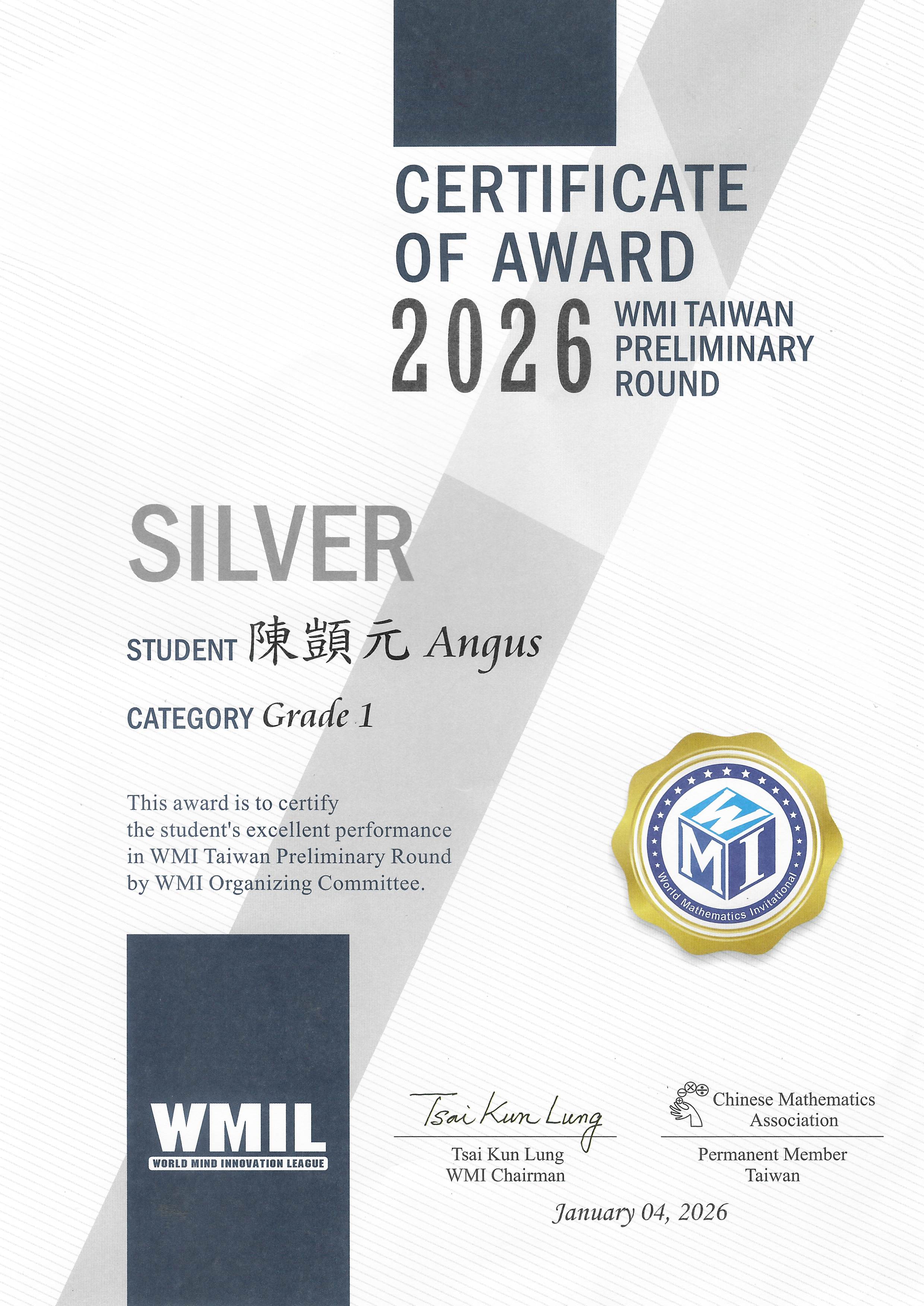 2026 3/3 賀 本校一義陳顗元同學參加2026WMI世界數學邀請賽臺灣選拔賽 成績優異 恭喜獲獎同學! 賀 本校一義陳顗元同學參加2026WMI世界數學邀請賽臺灣選拔賽 榮獲銀牌獎 恭喜獲獎同學!一義陳顗元WMI世界數學邀請賽.jpg 721.45 KB 返回