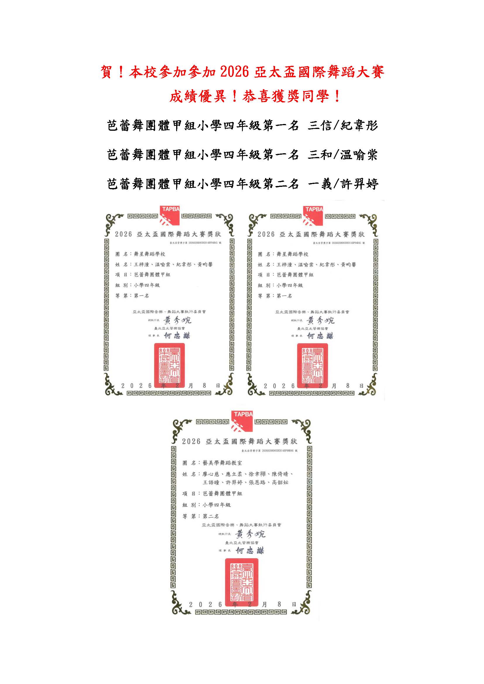 賀 本校參加參加2026亞太盃國際舞蹈大賽 成績優異 恭喜獲獎同學