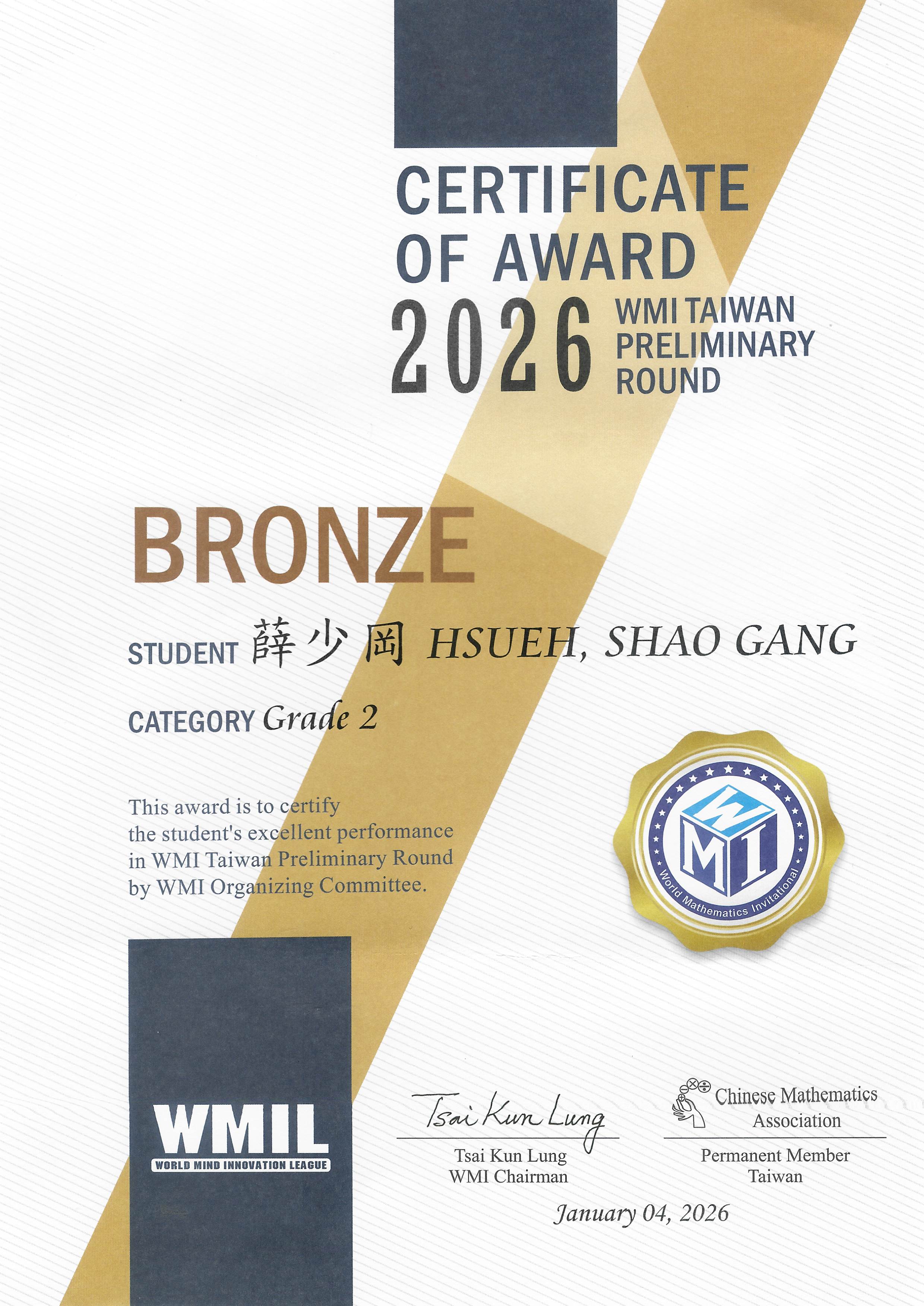 2026 3/23 賀 本校二忠薛少岡同學參加2026WMI世界數學邀請賽臺灣選拔賽 成績優異 恭喜獲獎同學! 賀 本校二忠薛少岡同學參加2026WMI世界數學邀請賽臺灣選拔賽 榮獲青銅獎 恭喜獲獎同學!二忠薛少岡.jpg 741.14 KB 返回