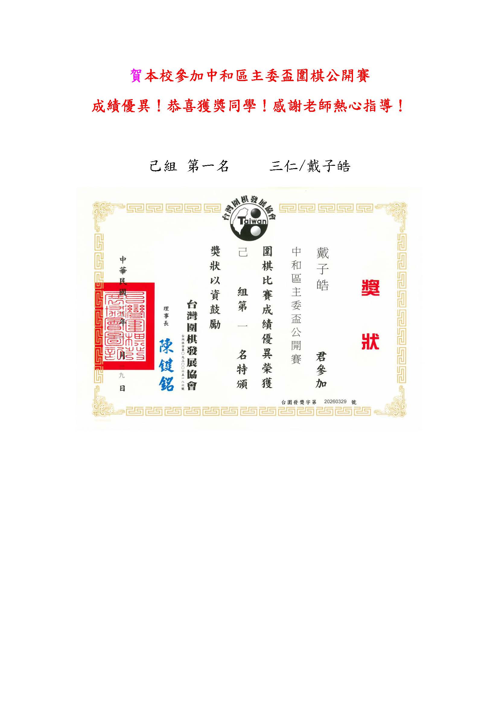 賀本 校參加中和區主委盃圍棋公開賽 成績優異恭喜獲獎同學