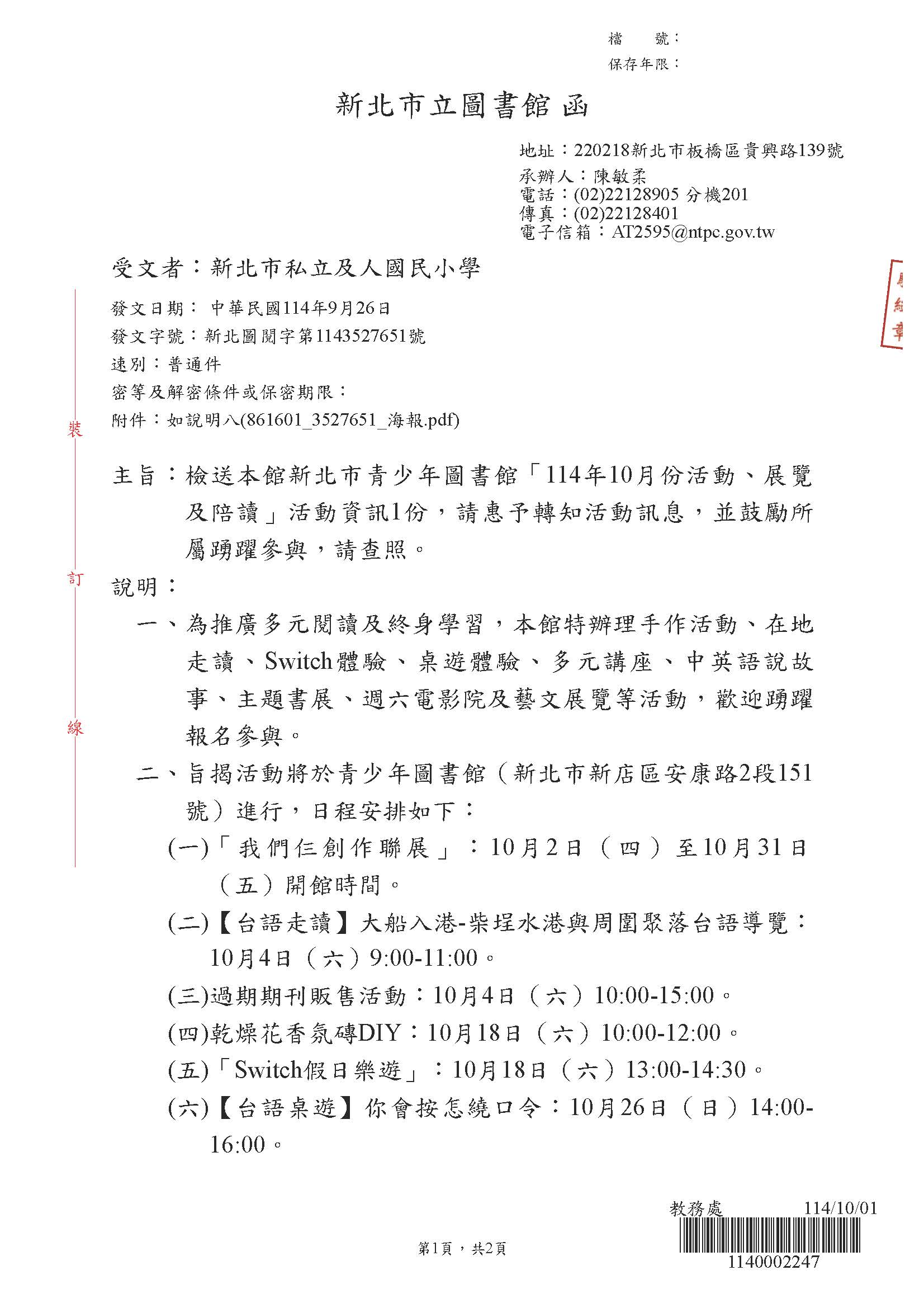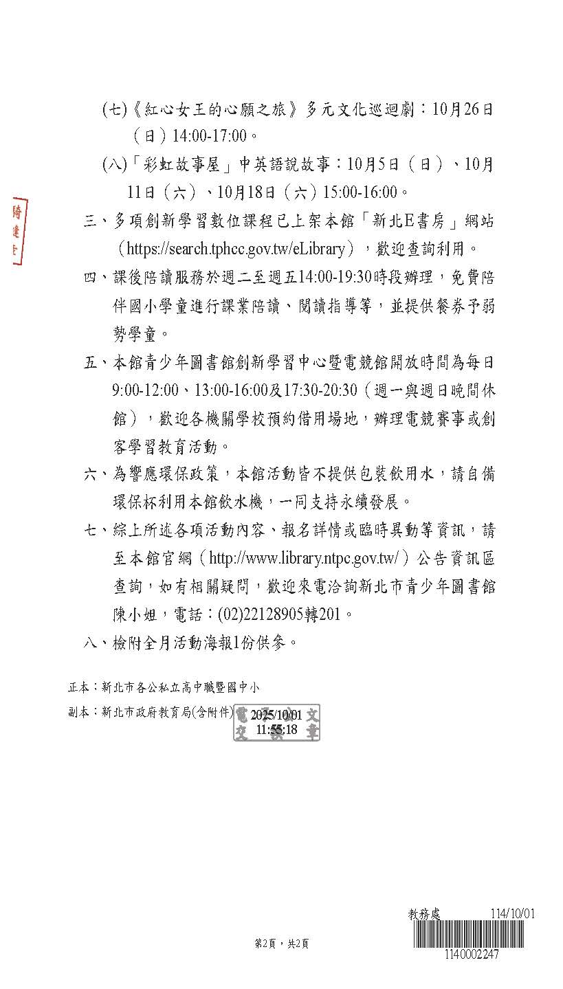 2025 10/1 青少年圖書館活動資訊 青少年圖書館活動資訊_頁面_1.jpg 282.91 KB青少年圖書館活動資訊_頁面_2.jpg 120.69 KB861601_3527651_海報.jpg 316.03 KB 返回