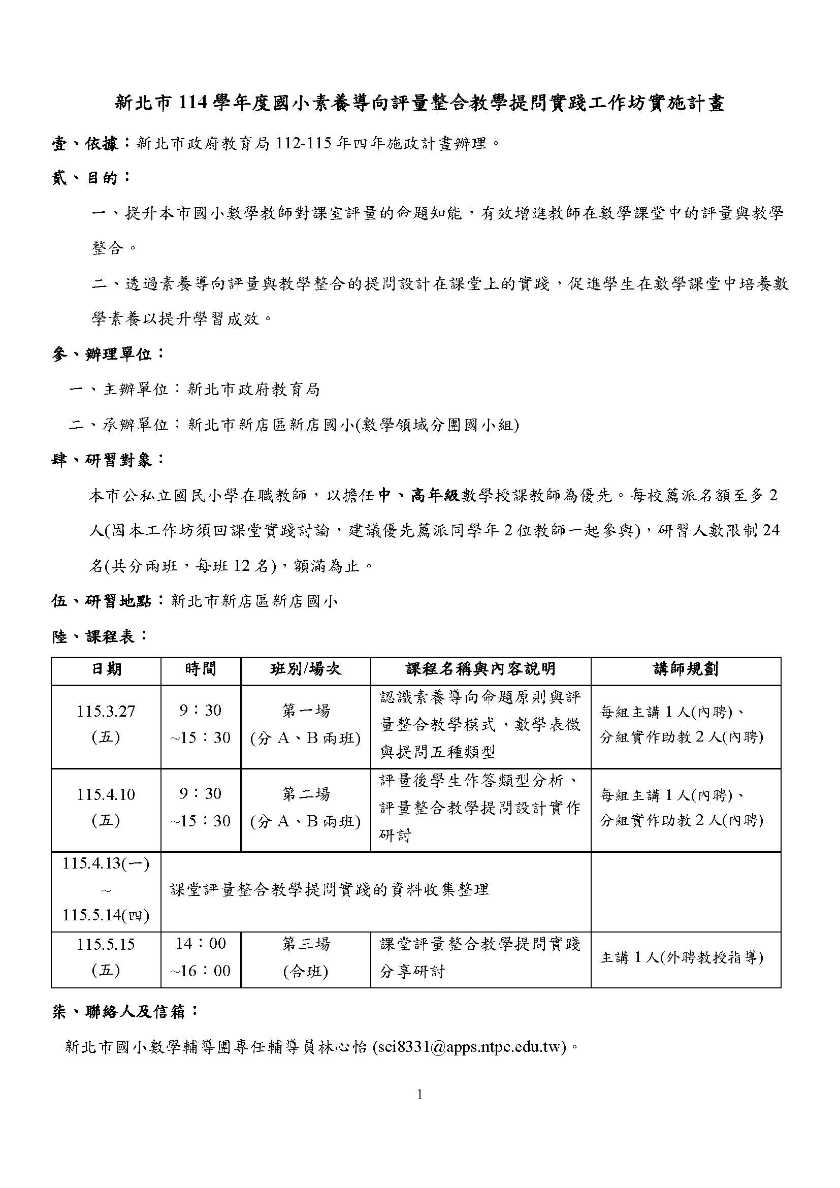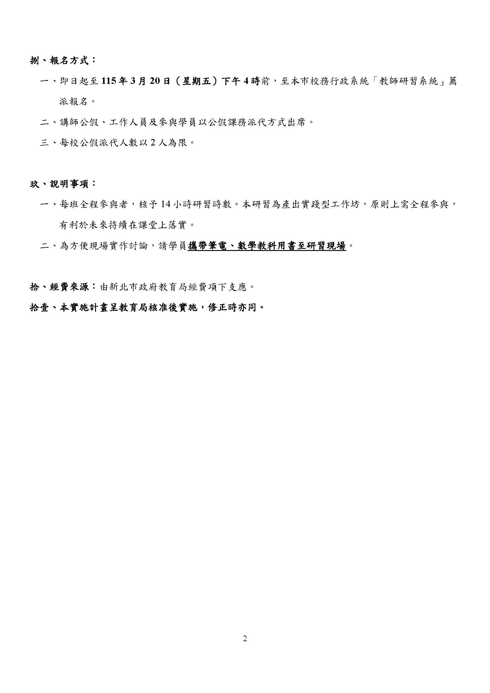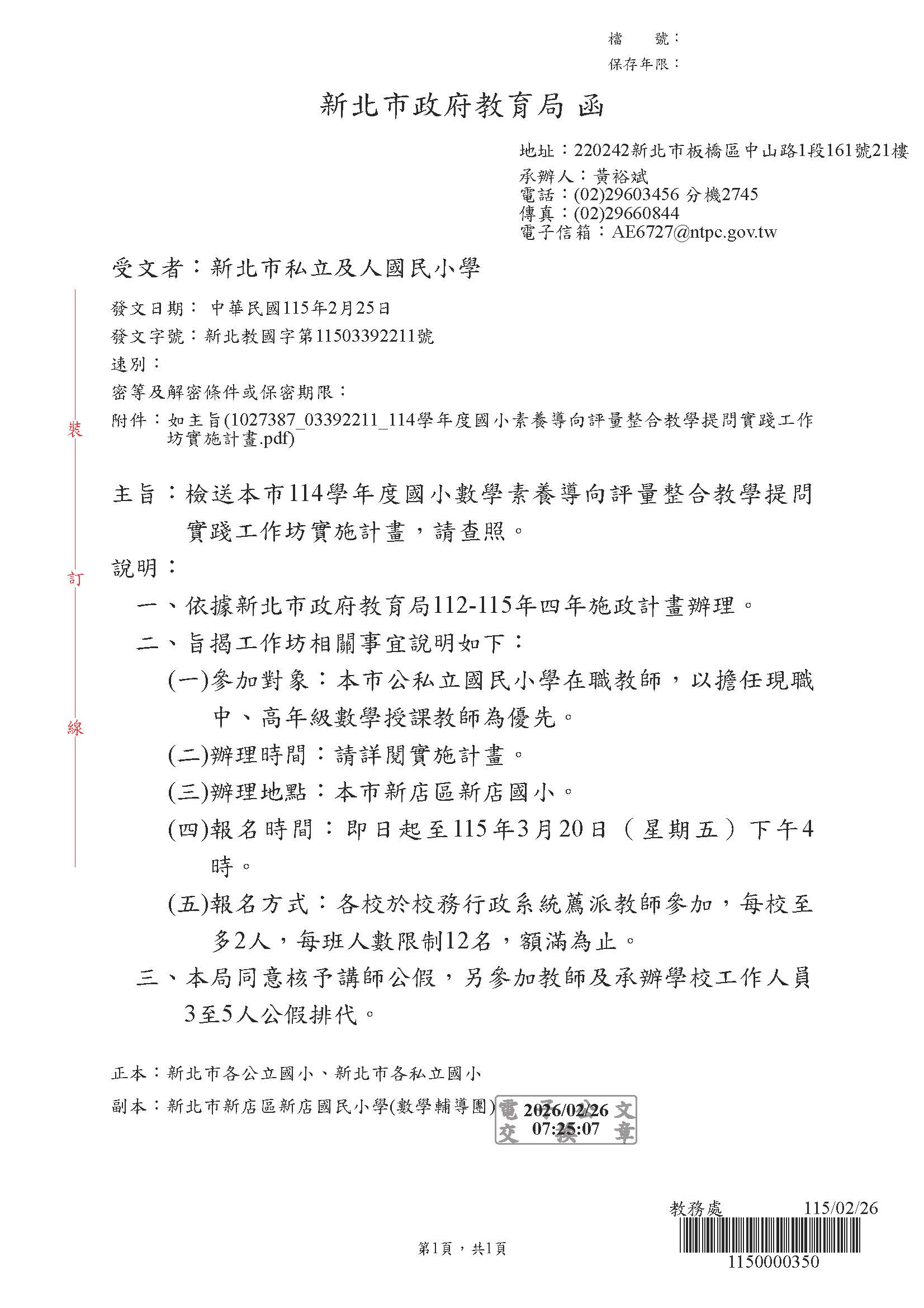 2026 2/26 新北市114學年度國小數學素養導向評量整合教學提問實踐工作坊實施計畫 SPEED Super Desk_頁面_1.jpg 273.25 KB1027387_03392211_114學年度國小素養導向評量整合教學提問實踐工作坊實施計畫_頁面_1.jpg 274.81 KB1027387_03392211_114學年度國小素養導向評量整合教學提問實踐工作坊實施計畫_頁面_2.jpg 142.38 KB 返回