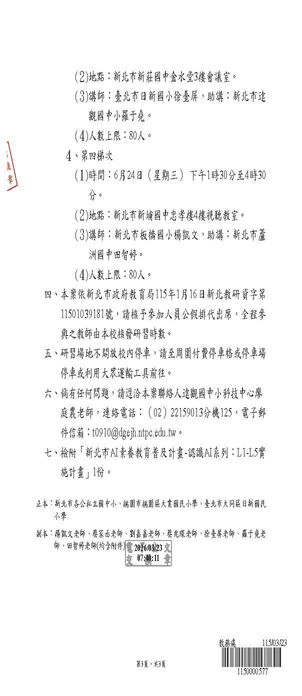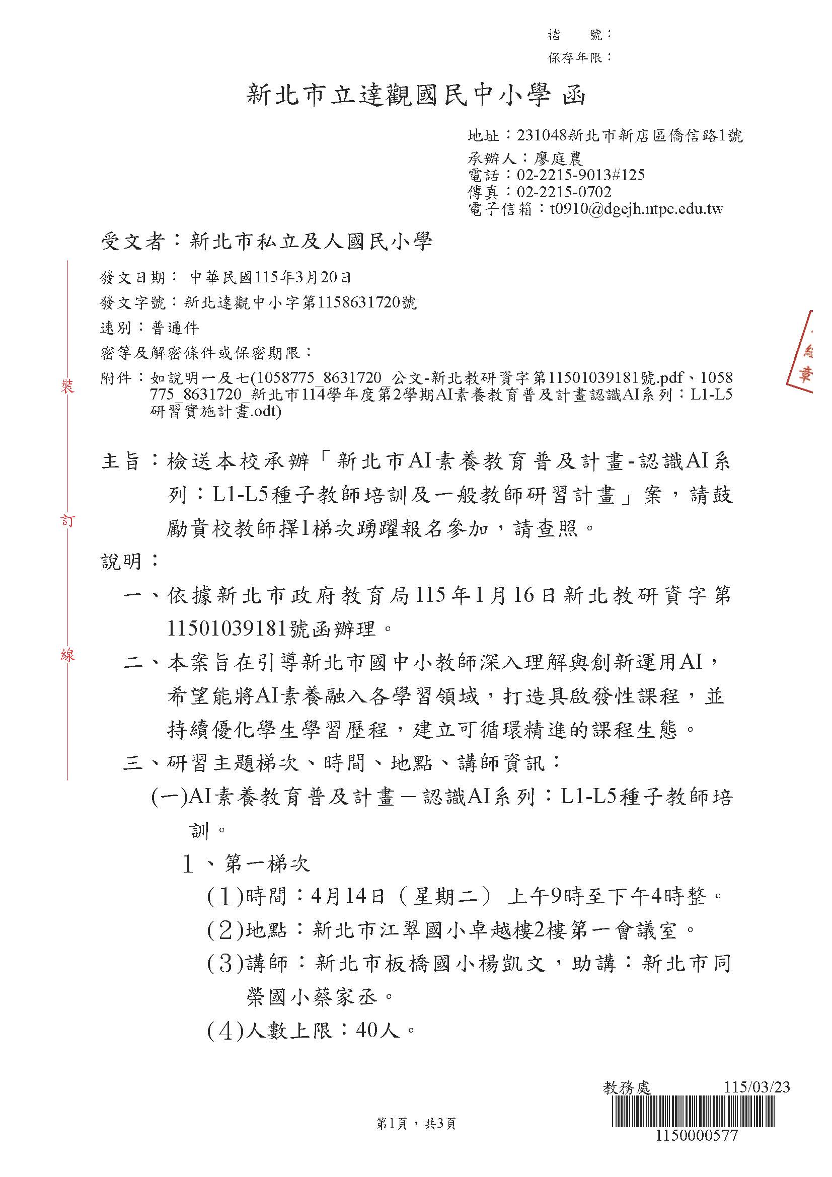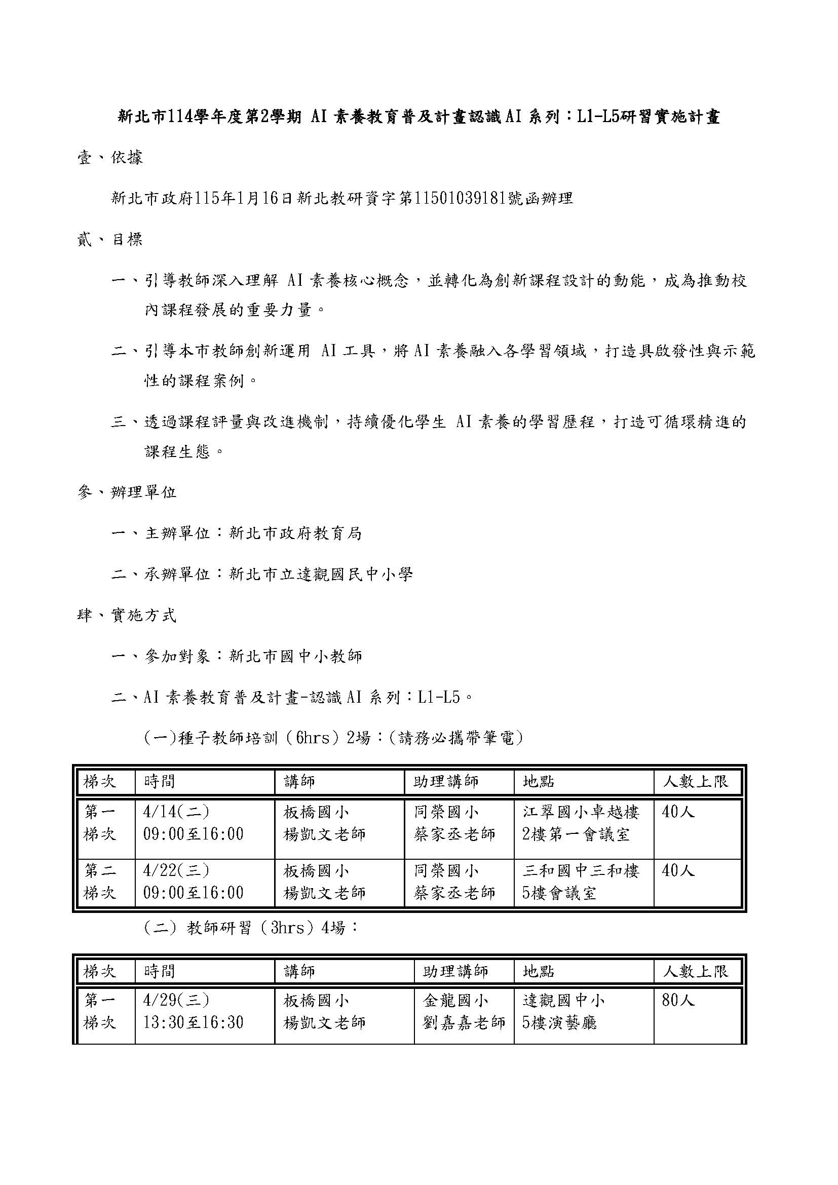 2026 3/24 新北市AI素養教育普及計畫-認識AI系列:L1-L5種子教師培訓及一般教師研習計畫 SPEED Super Desk_頁面_1.jpg 296.38 KBSPEED Super Desk_頁面_2.jpg 87.29 KBSPEED Super Desk_頁面_3.jpg 94.86 KB1058775_8631720_公文-新北教研資字第11501039181號_頁面_1.jpg 176.21 KB1058775_8631720_公文-新北教研資字第11501039181號_頁面_2.jpg 104.47 KB1058775_8631720_新北市114學年度第2學期AI素養教育普及計畫認識AI系列:L1-L5研習實施計畫_頁面_1.jpg 255.06 KB1058775_8631720_新北市114學年度第2學期AI素養教育普及計畫認識AI系列:L1-L5研習實施計畫_頁面_2.jpg 180.05 KB1058775_8631720_新北市114學年度第2學期AI素養教育普及計畫認識AI系列:L1-L5研習實施計畫_頁面_3.jpg 232.46 KB 返回