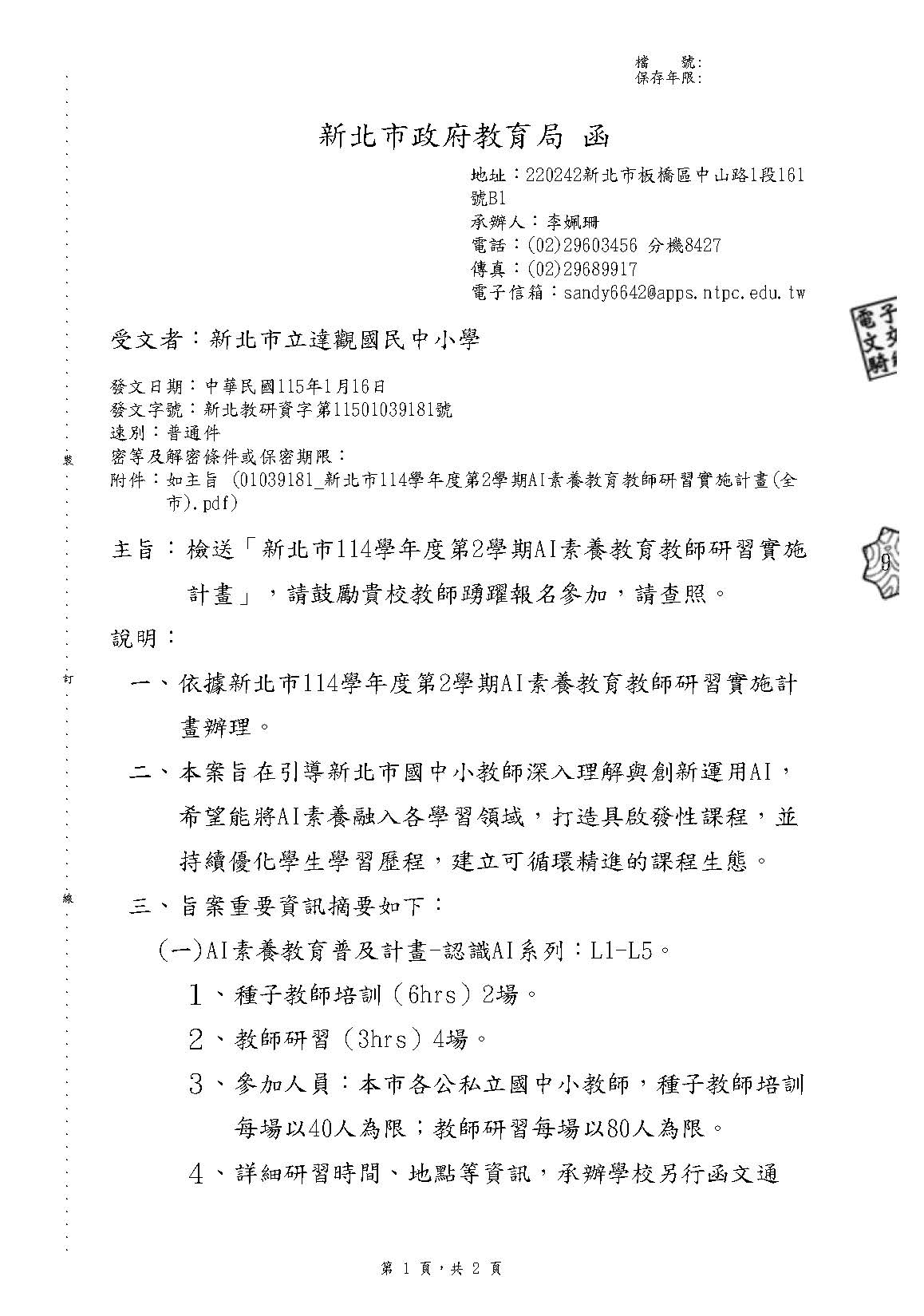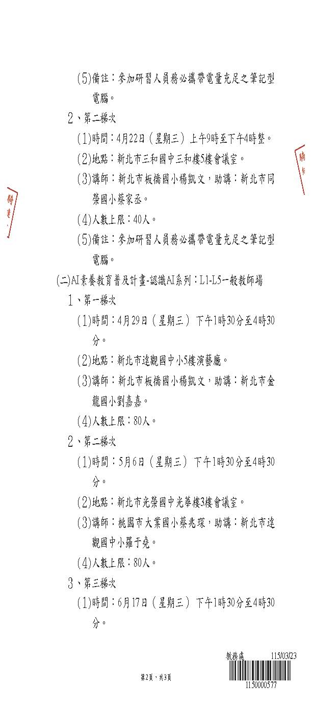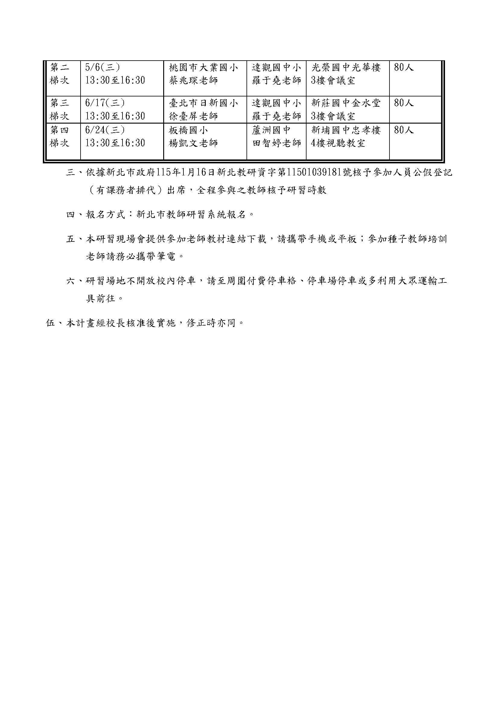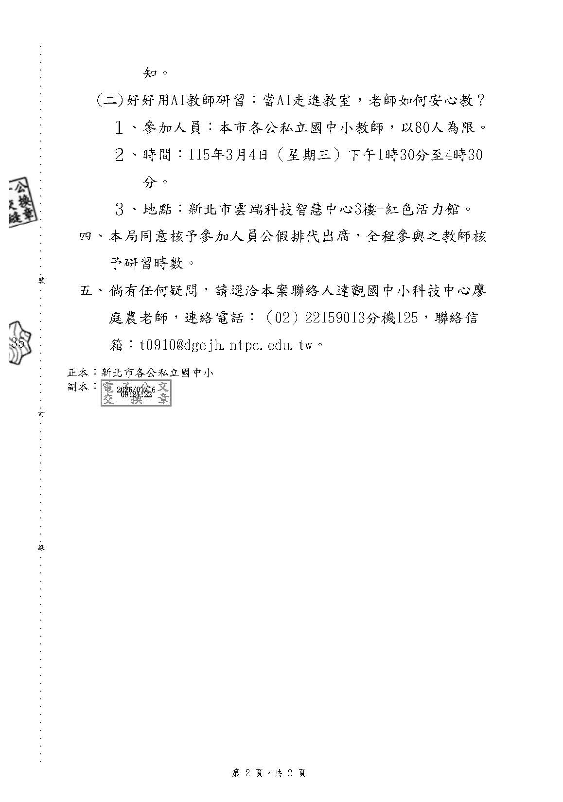 2026 3/24 新北市AI素養教育普及計畫-認識AI系列:L1-L5種子教師培訓及一般教師研習計畫 SPEED Super Desk_頁面_1.jpg 296.38 KBSPEED Super Desk_頁面_2.jpg 87.29 KBSPEED Super Desk_頁面_3.jpg 94.86 KB1058775_8631720_公文-新北教研資字第11501039181號_頁面_1.jpg 176.21 KB1058775_8631720_公文-新北教研資字第11501039181號_頁面_2.jpg 104.47 KB1058775_8631720_新北市114學年度第2學期AI素養教育普及計畫認識AI系列:L1-L5研習實施計畫_頁面_1.jpg 255.06 KB1058775_8631720_新北市114學年度第2學期AI素養教育普及計畫認識AI系列:L1-L5研習實施計畫_頁面_2.jpg 180.05 KB1058775_8631720_新北市114學年度第2學期AI素養教育普及計畫認識AI系列:L1-L5研習實施計畫_頁面_3.jpg 232.46 KB 返回