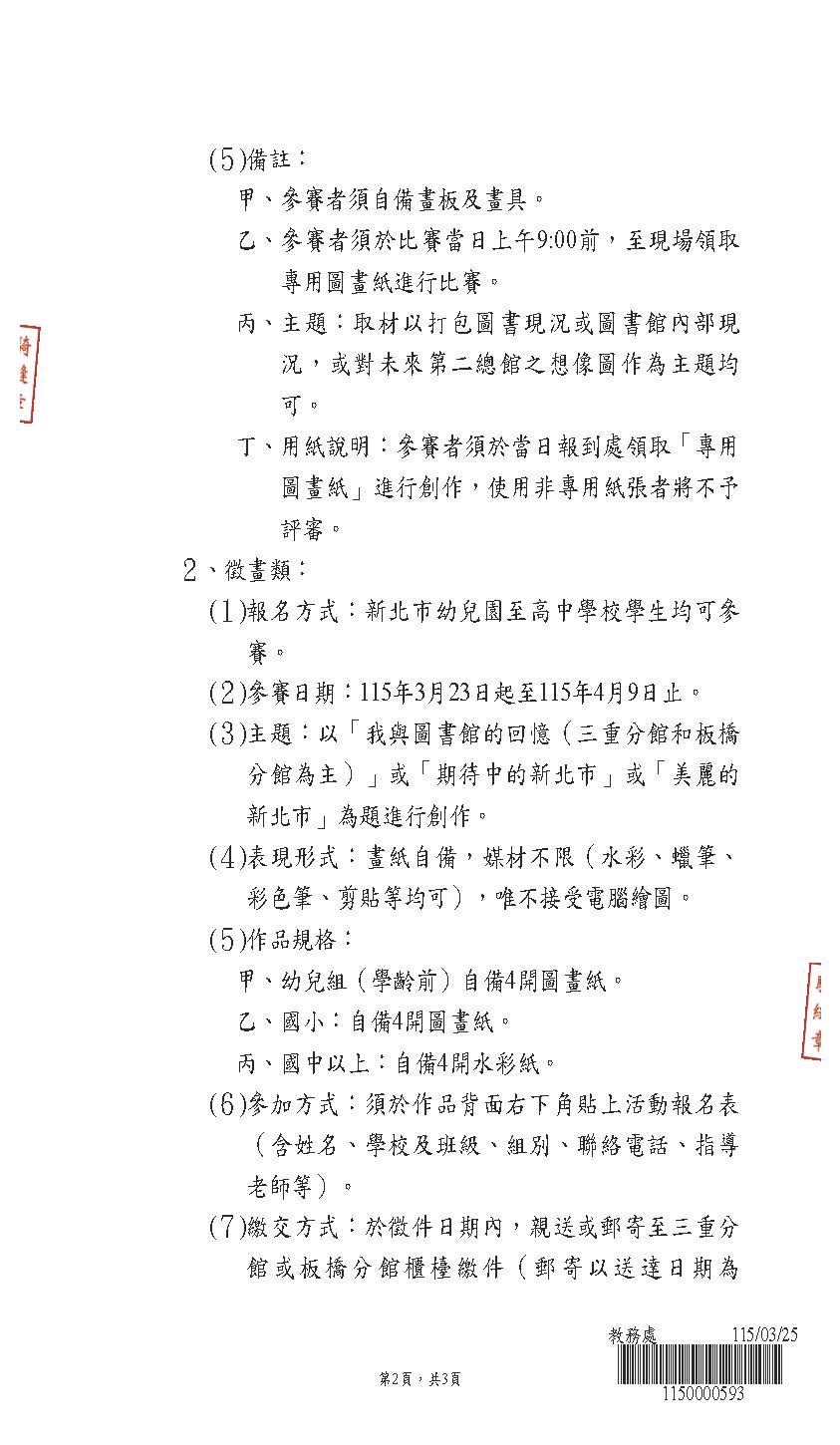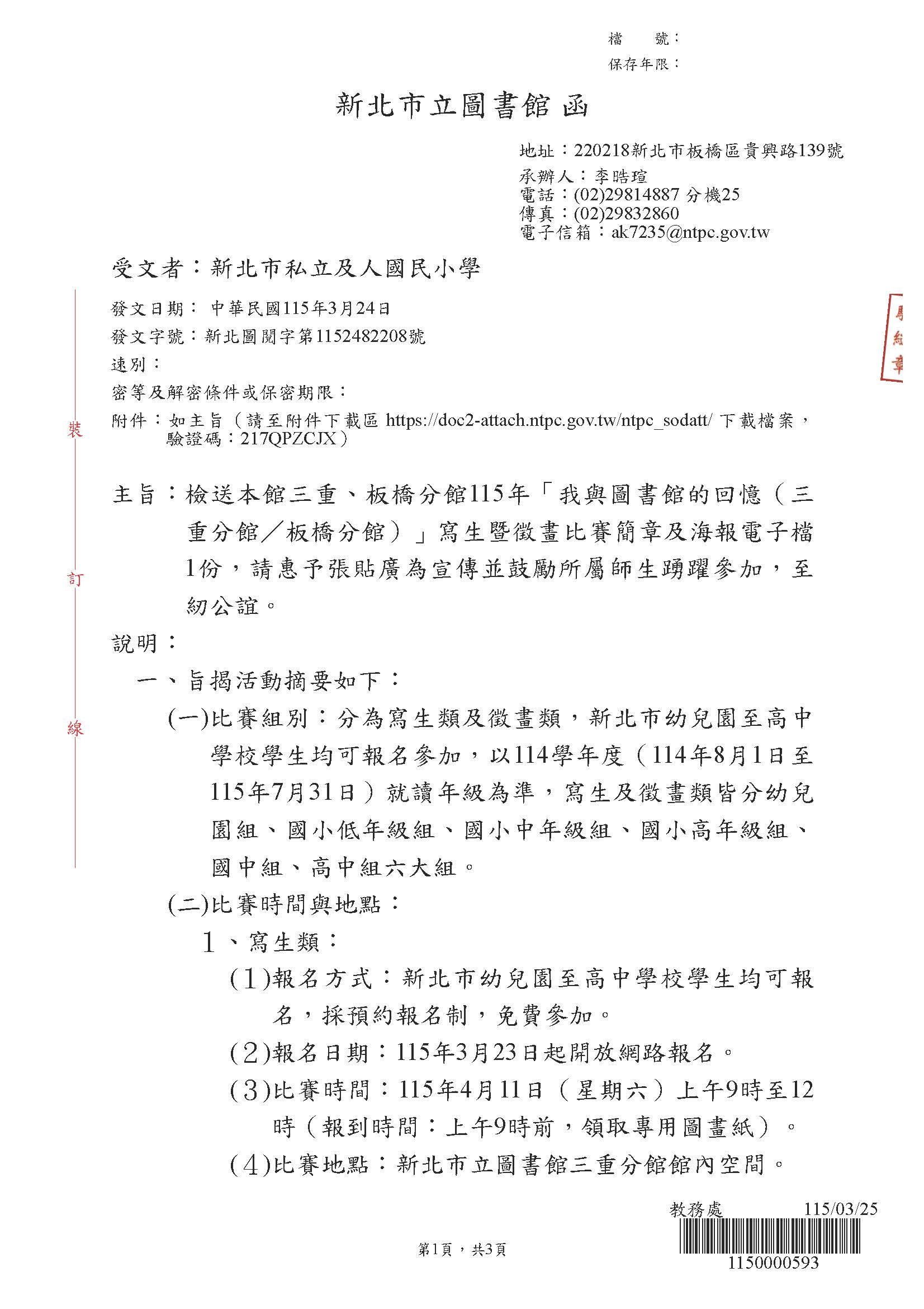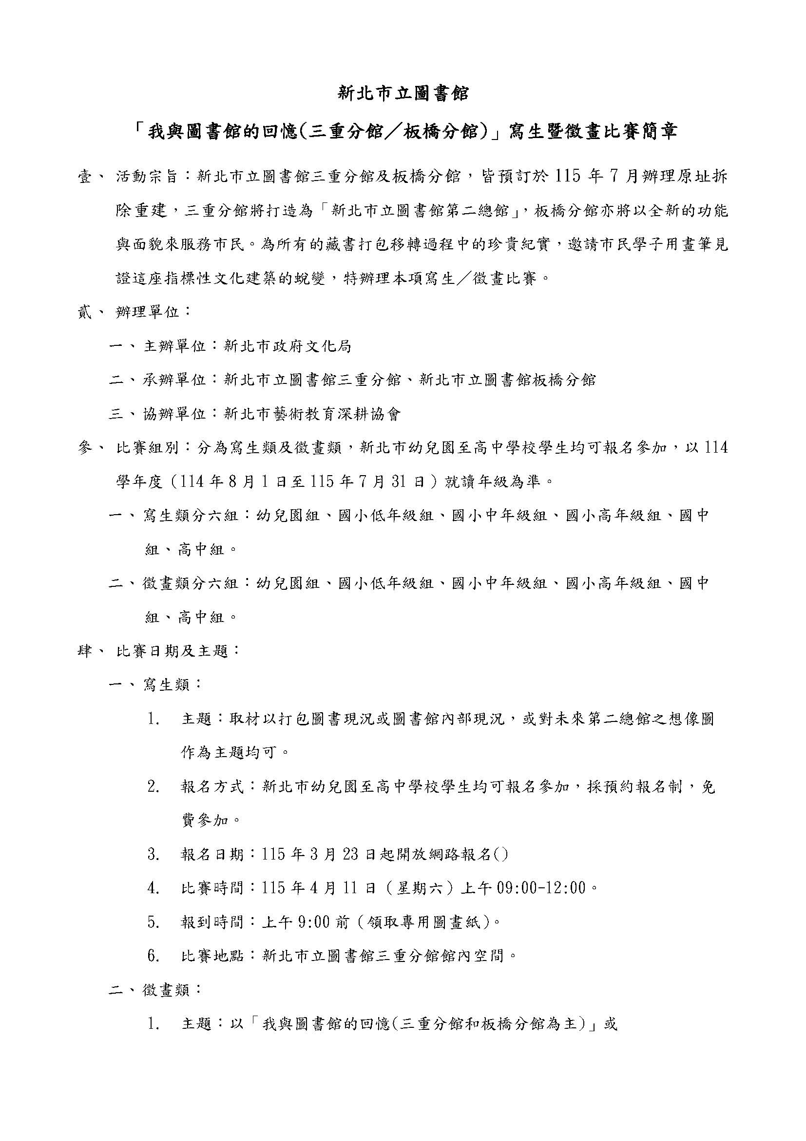 2026 3/25 「我與圖書館的回憶(三重分館/板橋分館)」寫生暨徵畫比賽簡章及海報 SPEED Super Desk_頁面_1.jpg 288.9 KBSPEED Super Desk_頁面_2.jpg 117.43 KBSPEED Super Desk_頁面_3.jpg 78.59 KB三重板橋寫生徵畫海報.jpg 697.26 KB簡章—三重及板橋寫生及徵畫比賽_頁面_1.jpg 247.4 KB簡章—三重及板橋寫生及徵畫比賽_頁面_2.jpg 220.36 KB簡章—三重及板橋寫生及徵畫比賽_頁面_3.jpg 279.38 KB簡章—三重及板橋寫生及徵畫比賽_頁面_4.jpg 162.03 KB 返回