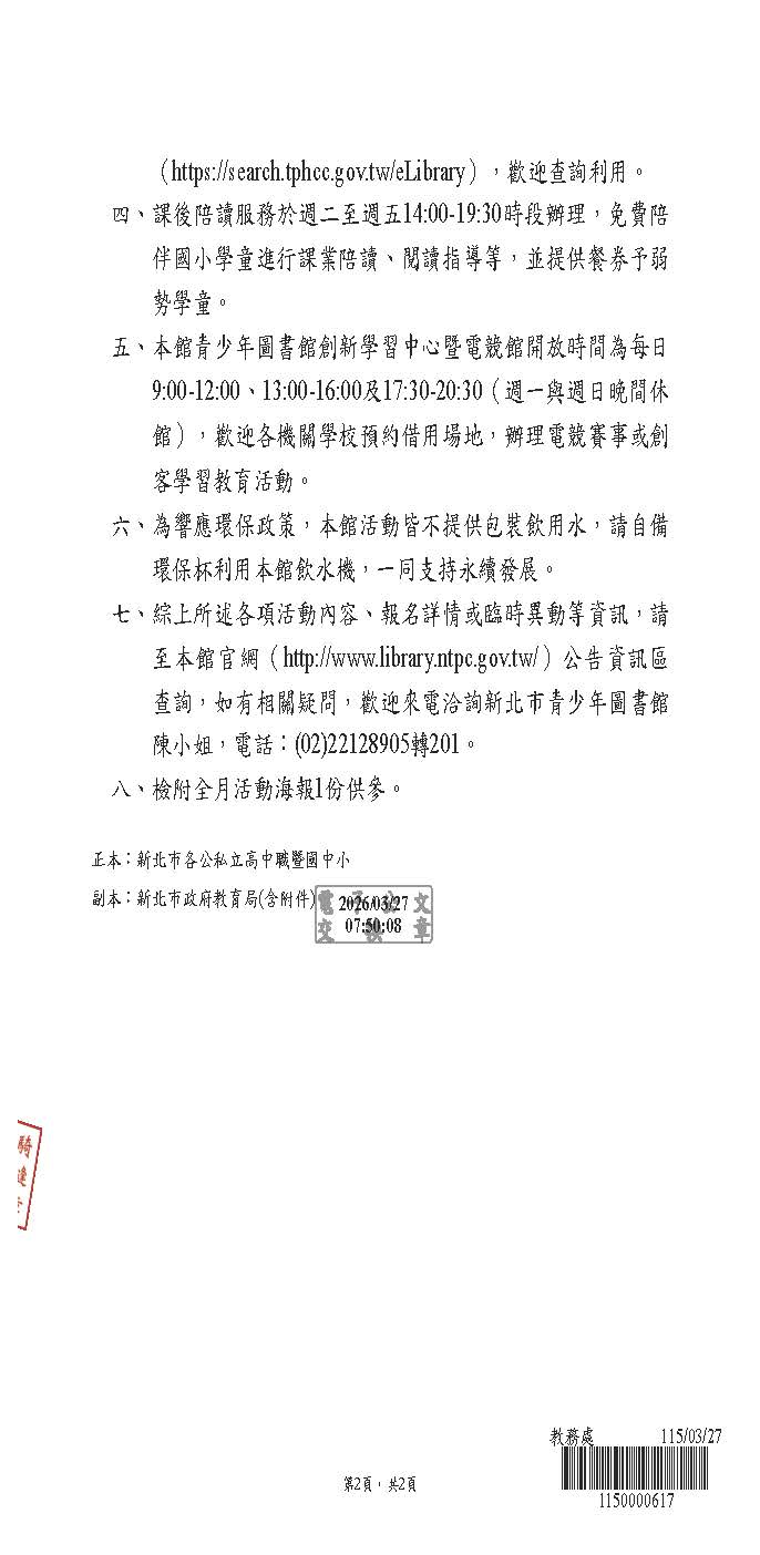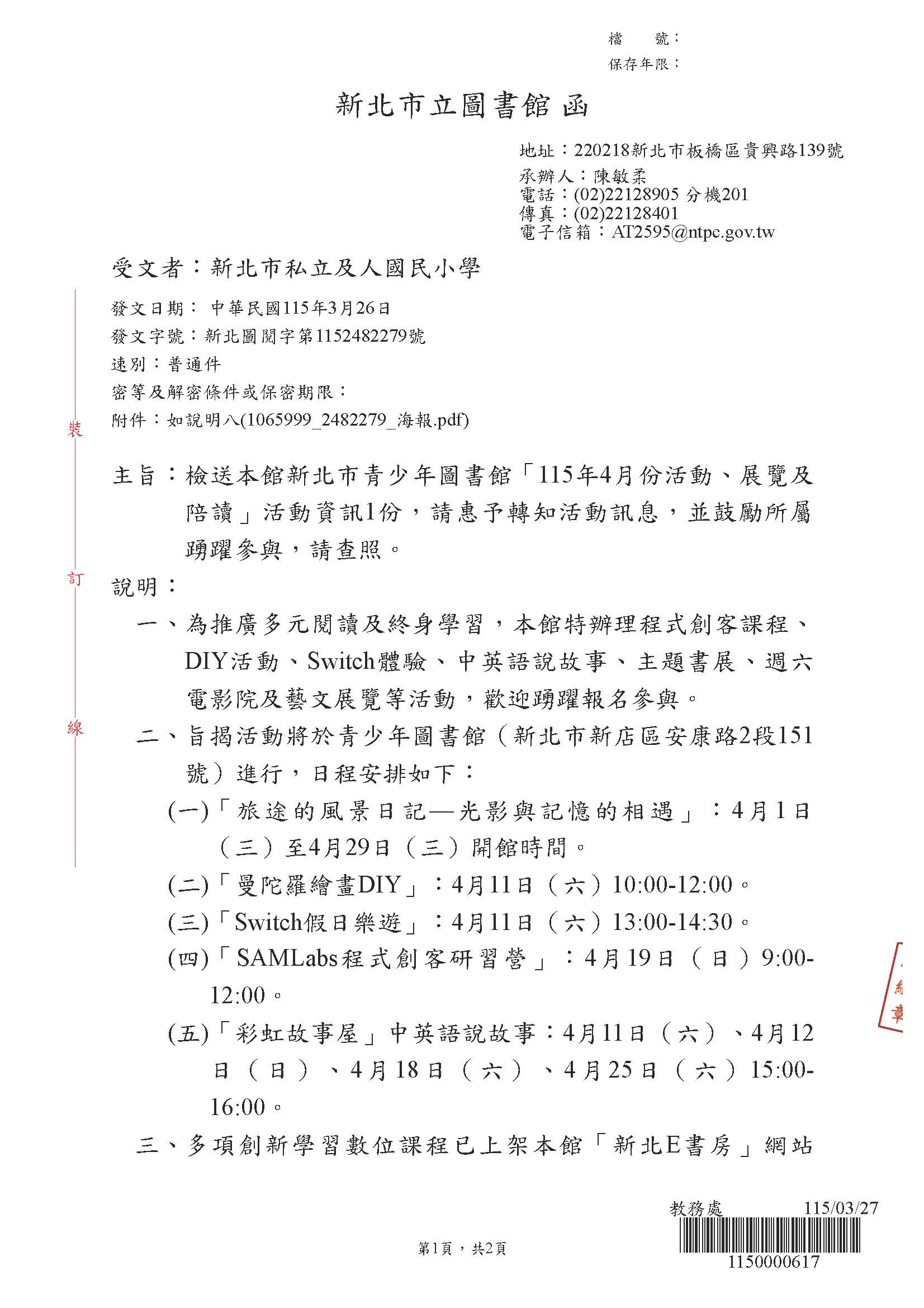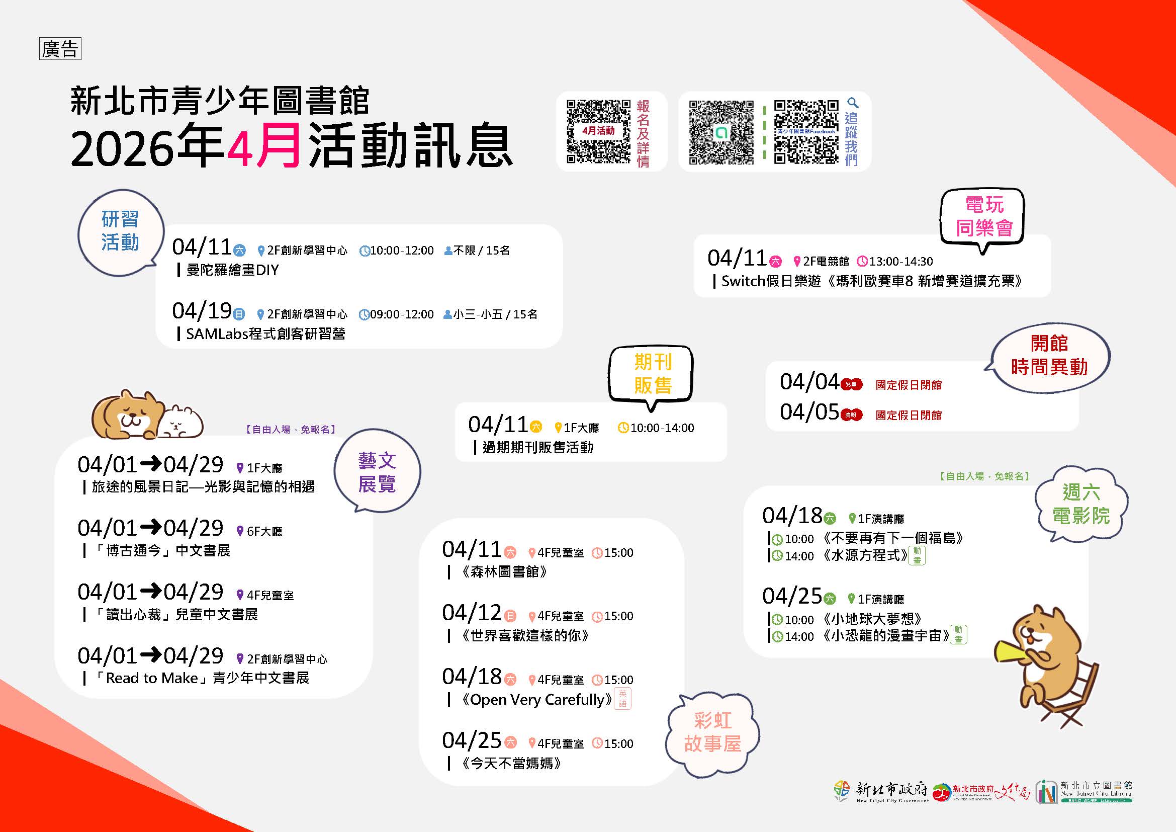 2026 3/27 新北市青少年圖書館「115年4月份活動、展覽及陪讀」活動資訊 SPEED Super Desk_頁面_1.jpg 284.09 KBSPEED Super Desk_頁面_2.jpg 87.06 KB1065999_2482279_海報.jpg 290.47 KB 返回