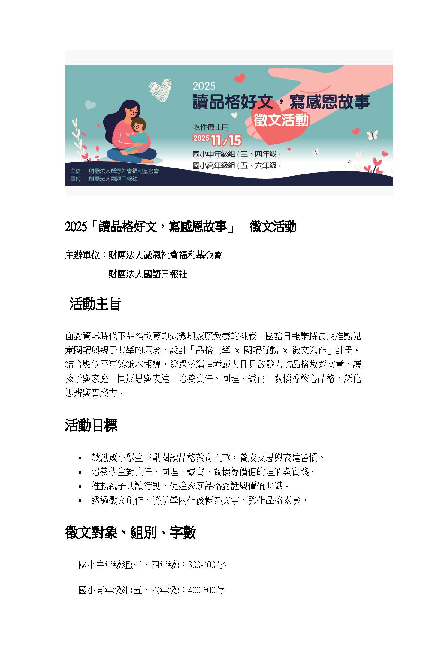 2025 10/7 讀品格好文寫感恩故事徵文活動 SPEED Super Desk_頁面_1.jpg 304.09 KB866620_2510010008_1140000067_ATTACH1_頁面_1.jpg 218.59 KB866620_2510010008_1140000067_ATTACH1_頁面_2.jpg 271.29 KB866620_2510010008_1140000067_ATTACH1_頁面_3.jpg 269.8 KB866620_2510010008_1140000067_ATTACH1_頁面_4.jpg 212.69 KB 返回