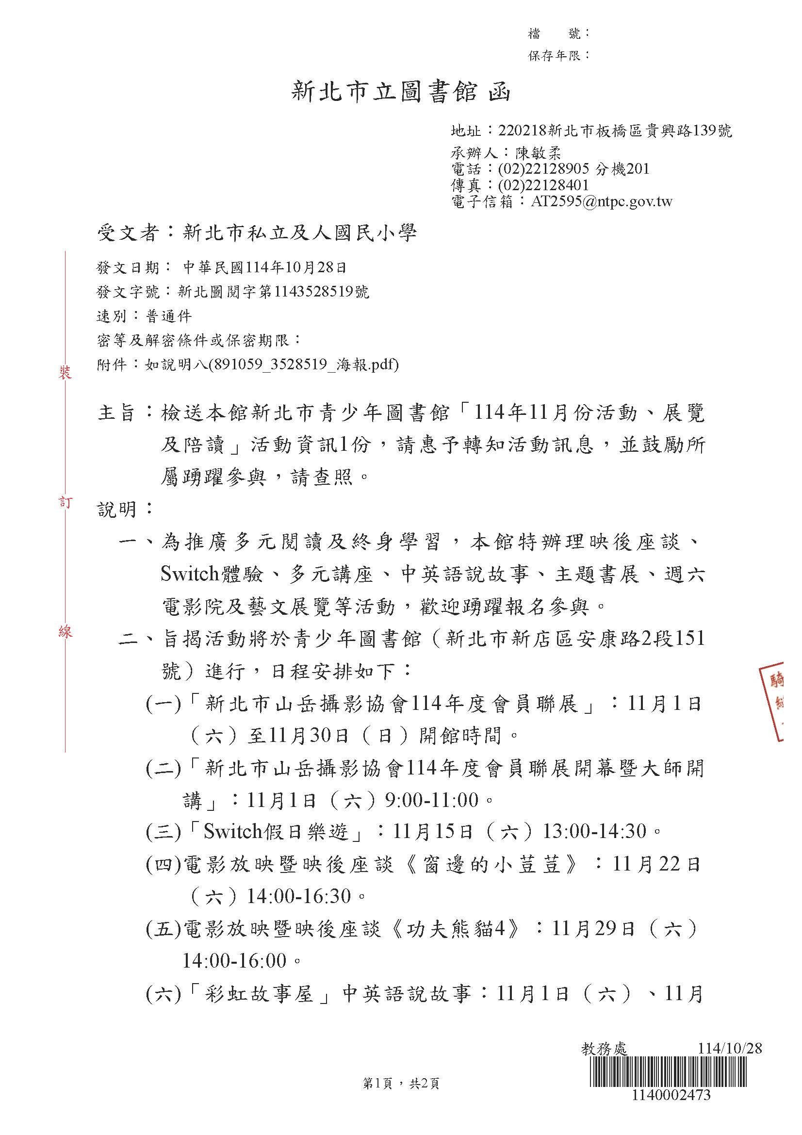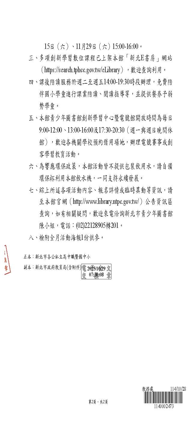 2025 10/30 新北市青少年圖書館11月份活動站覽及陪讀資訊 SPEED Super Desk_頁面_1.jpg 289.42 KBSPEED Super Desk_頁面_2.jpg 90.7 KB891059_3528519_海報.jpg 282.49 KB 返回